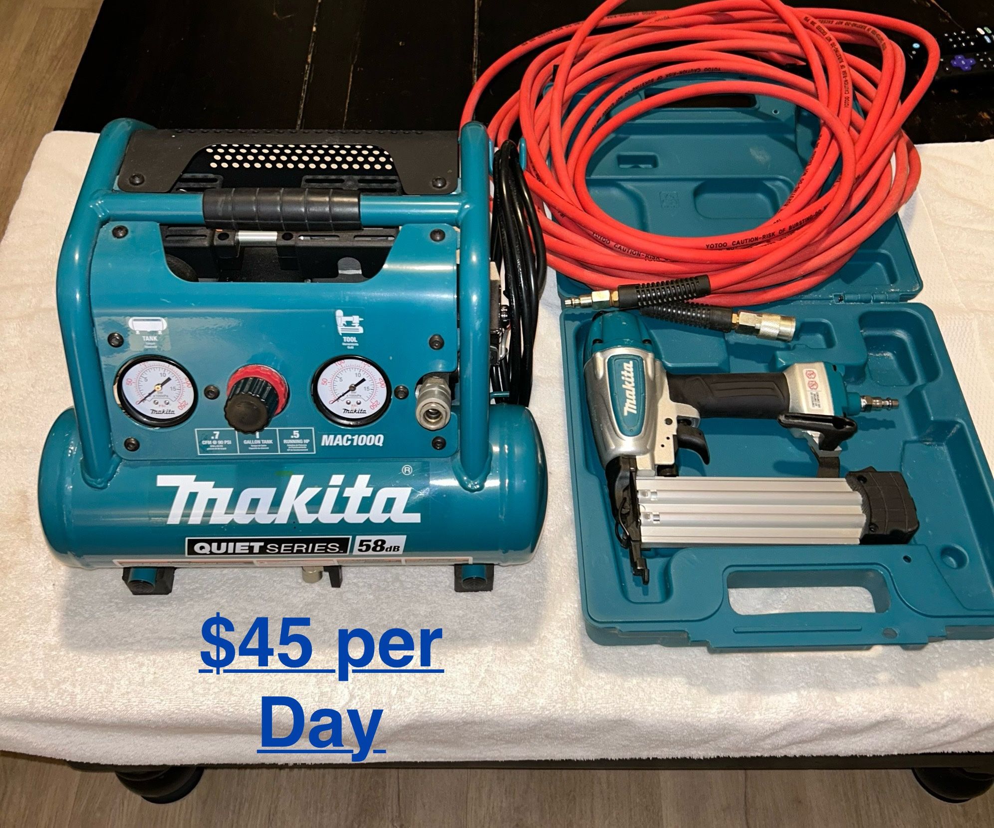 Makita Brad Nailer plus compressor. Perfect for trim and finishing work. $45per day + dep & ID. Half the Home Depot daily rate. Local only near Miracosta Oceanside. Message for more info.