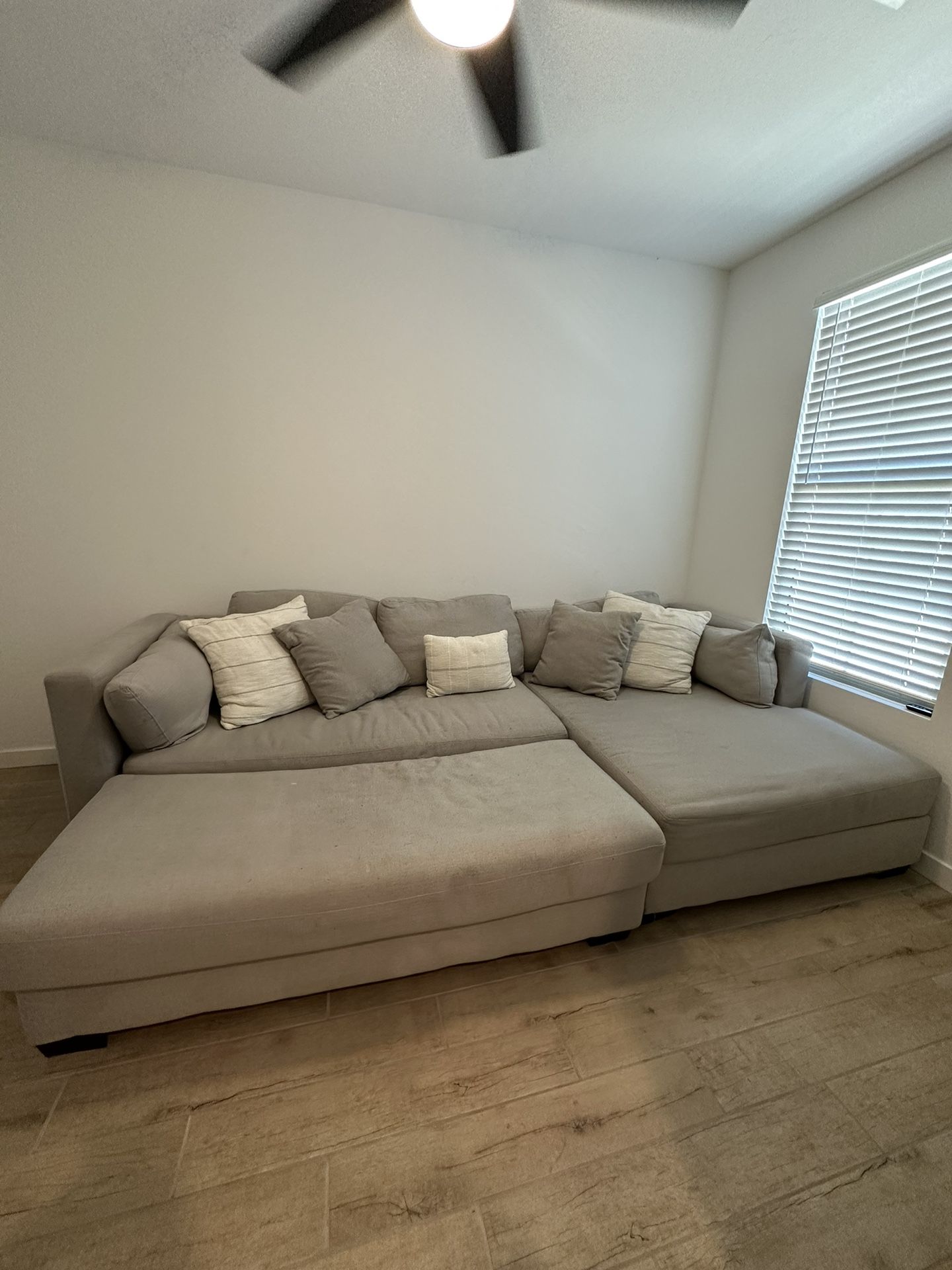 Grey couch with chaise lounge and ottoman. Pillows included. Dimensions shown in second photo. Cash only.
