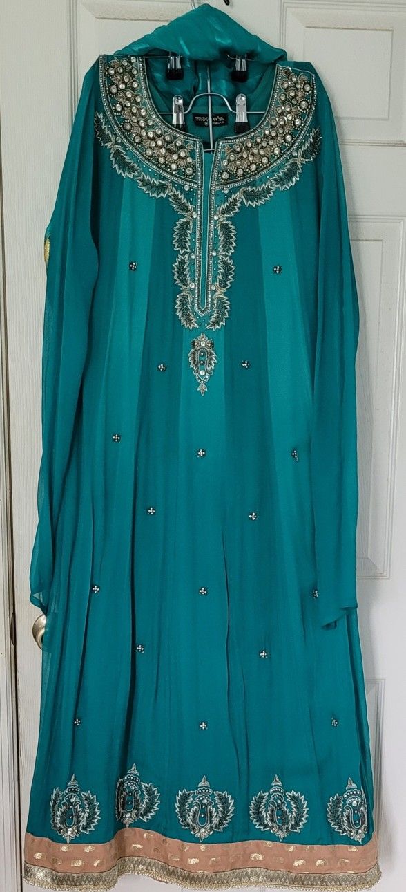 Lightly used traditional Pakistani event dress with pant and scarf.. Color: green and gold