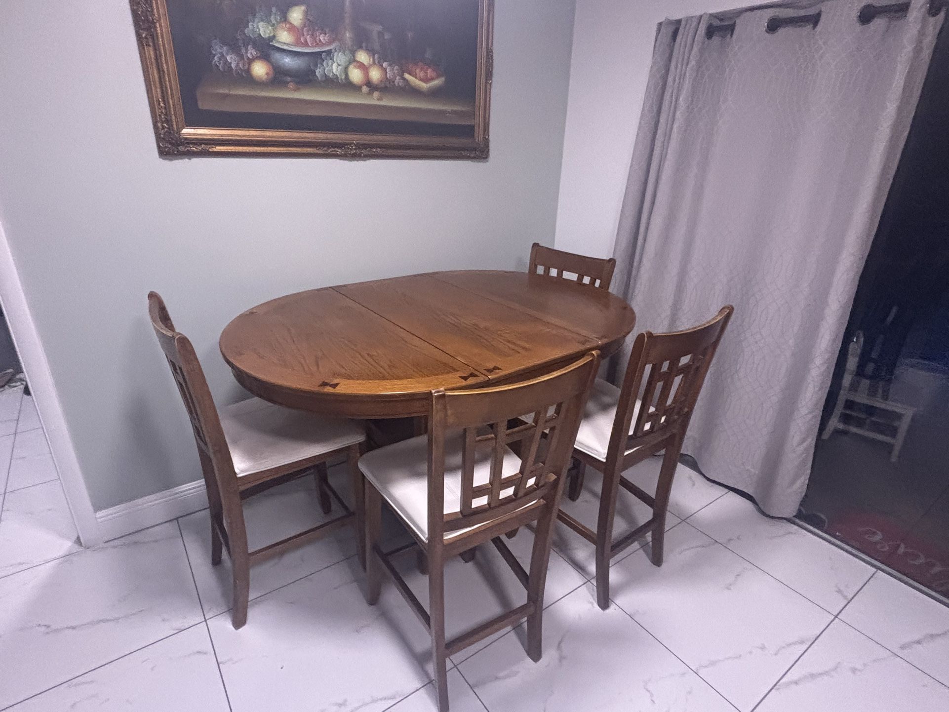 Beautiful oval dining table with drop-leaf butterfly extensions and 4 matching chairs. Finished in a warm wood-look tone with a classic vintage / craftsman style. Expands easily to seat up to 6, or folds down to save space perfect for apartments, breakfast nooks, or small dining areas. Sturdy, well cared for, and very comfortable for everyday use or guests.