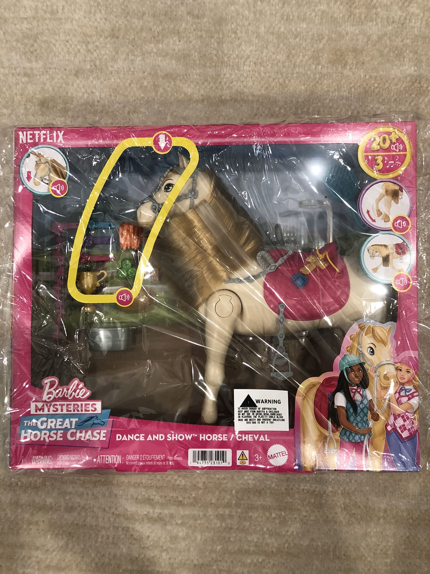 Inspired by the series Barbie Mysteries: The Great Horse Chase, this interactive toy horse has 20+ sounds and so many ways to play! Pull the tassels to see the horse dance! Press the gem on the saddle for songs inspired by the show! Help the horse take a bow for cheer sounds! To play out nurturing moments, pet the horse's head and see its eyes close and hear it neigh. Groom and style the horse with the comb and adorable hair clips, extensions, and gems. Additional accessories include a trophy and food pieces to encourage storytelling play! Kids (ages 3 years old and up) can let their imaginations run wild with this Barbie show horse!