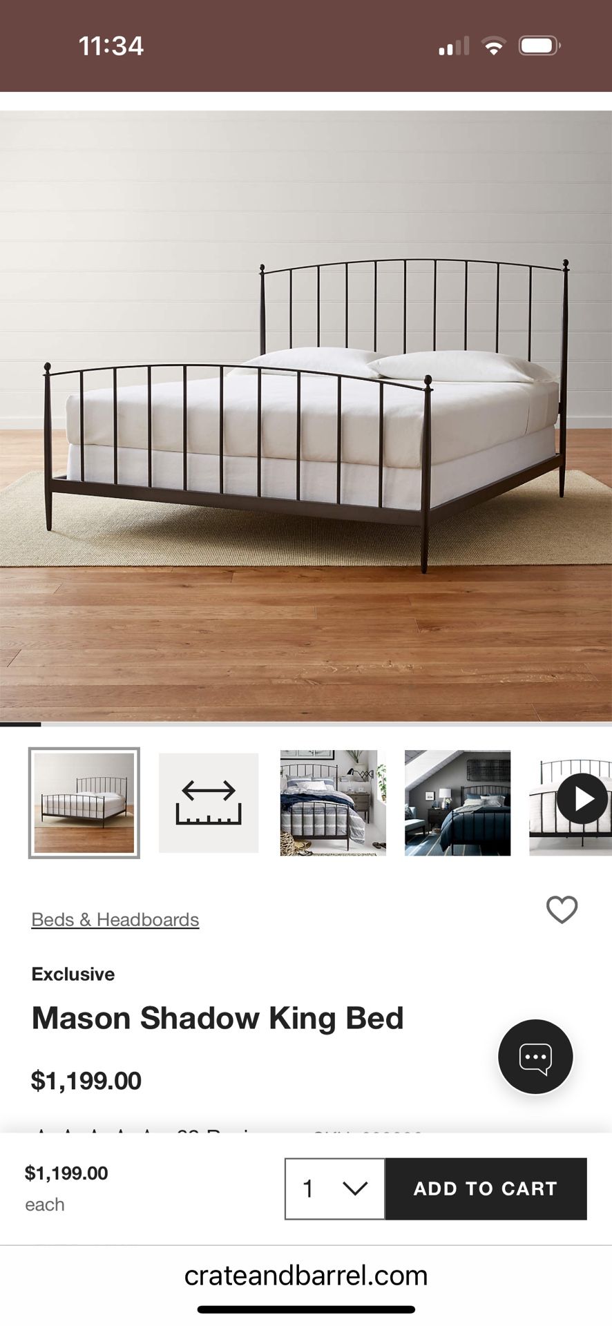 Brand New—still in box! I have 8 of these bed frames. The pictures are a current listing from the C&B website-the bed frame is currently on back order. Listed for $1199 online, I am selling for $899 -no tax, no shipping—a savings of $579! Pick up only. 54.75”H 78.5”W 82.5” -Designed by Royce Nelson -Solid iron and steel tubing with charcoal powdercoat finish -3 metal slats -Box spring required -Accommodates mattress and box spring (sold separately)