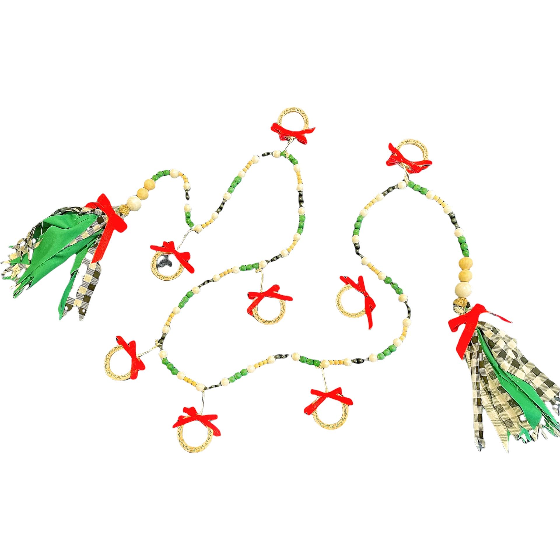 Handmade garlands. Each one has been uniquely made with a variety of wooden beads, ribbon, and wooden cut-out shapes. Various lengths. Prices range from $12-$30.