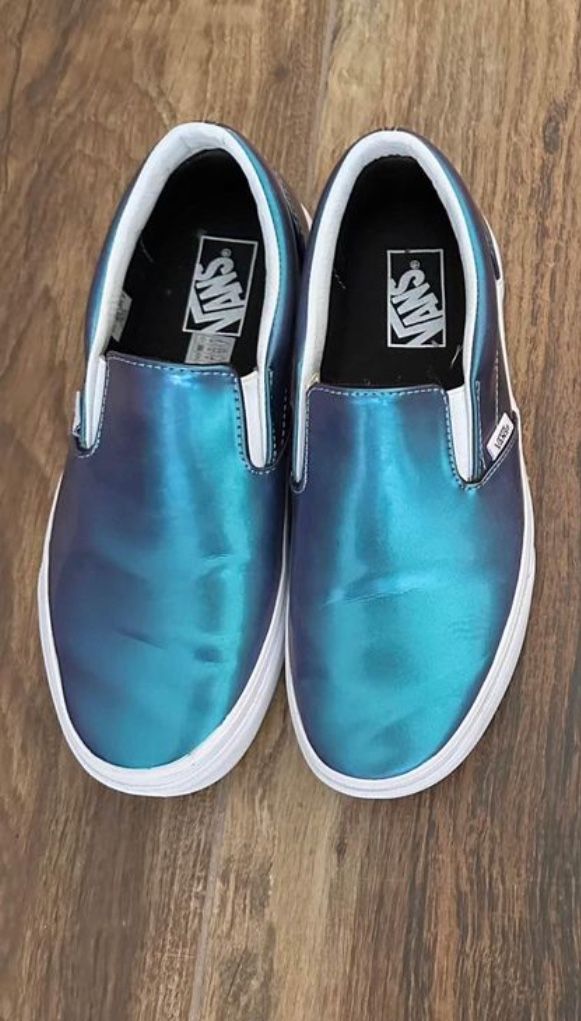 Vans Unisex Patent Leather Slip- on Sneakers in Iridescent Hollgraphic Blue. Never worn. Size Men’s 7.5/Women’s 9.
