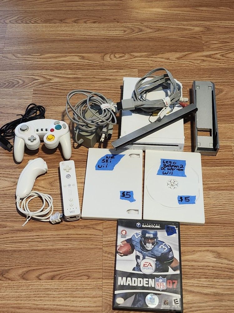 White Nintendo Wii/Gamecube Console one wii remote with num chuck Gamecube Controller 2 wii games and 1 Gamecube game. Comes complete tested and works.