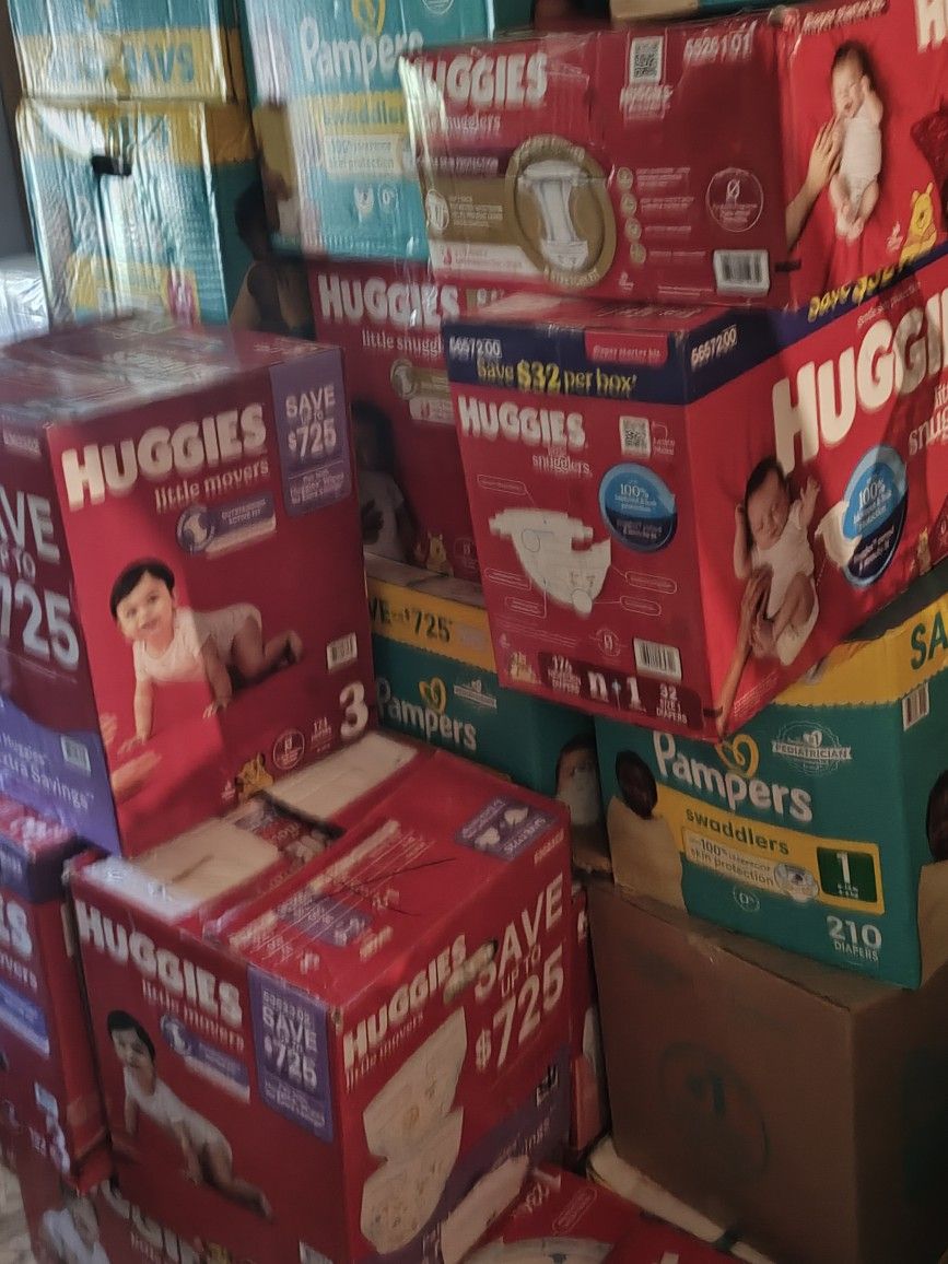 New in the box Pampers or Huggies. These are the big boxes of diapers. Most sizes available.