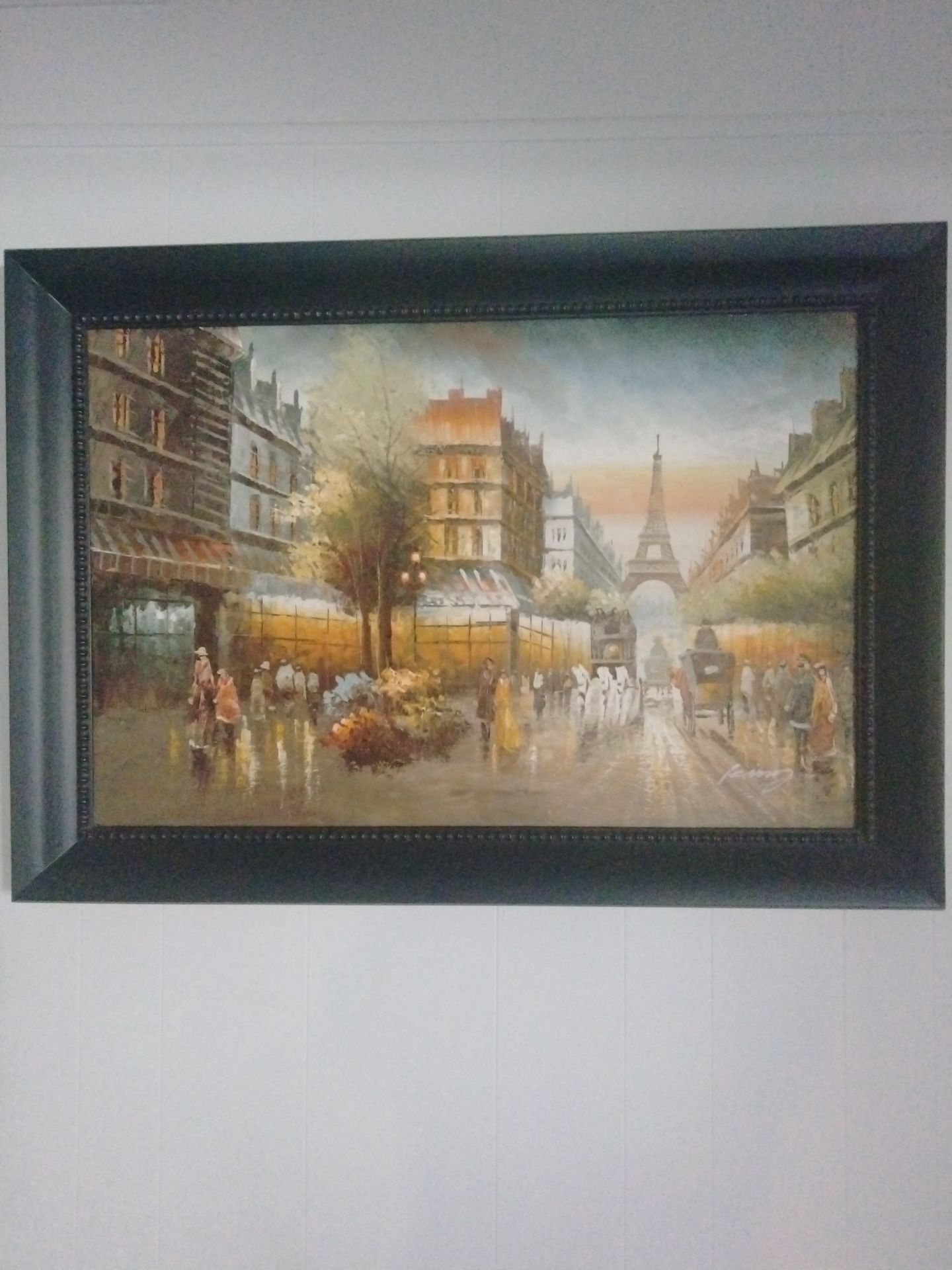 Large Framed Paris Street Scene Painting Wall Art Large horizontal framed wall art featuring a beautiful Paris street scene with the Eiffel Tower in the background. The artwork shows a rainy city street with people walking, warm lights from buildings, and classic European architecture. It has a stylish dark frame and makes a great centerpiece for a living room, hallway, or office. Approximate size: Large wide-format wall piece (about 3–4 feet wide). The painting is in good condition and ready to hang. Great decorative piece for anyone who likes Paris, city landscapes, or vintage-style artwork. Additional details: • Framed and ready to mount • Neutral colors match many home styles • Perfect for living room, office, or bedroom decor • Pickup only