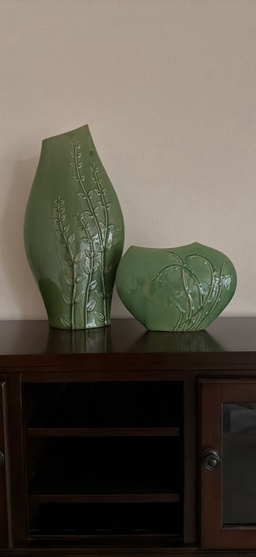 Beautiful ceramic vases! Would love to sell these together, but I am willing to separate! $30 for the bigger one $20 for the smaller one Larger vase 24 1/2” H x 13” W Smaller vase 10 1/2” H x 14 3/4” W Cash, Zelle or Venmo