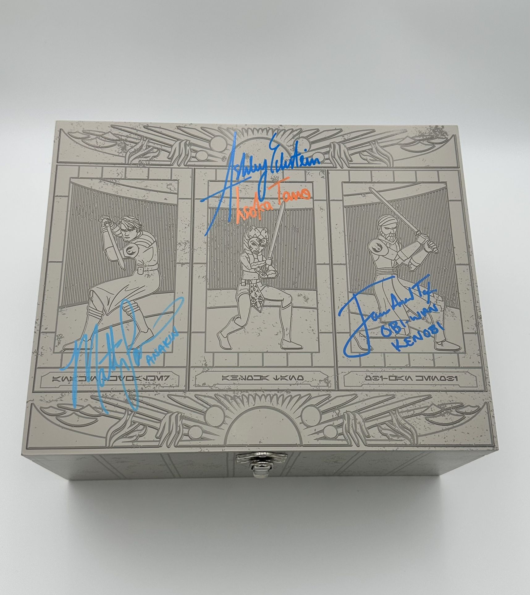 DISNEY STAR WARS GALAXY'S EDGE CLONE WARS LIGHTSABER HILTS LIMITED EDITION SET CUSTOM SIGNED PSA CERTIFICATION LETTER OF AUTHENTICITY SIGNED BY Ashley Eckstein - James Arnold Taylor Matt Lanter A must have for the serious collector, this Star Wars: The Clone Wars Lightsaber hilt set is inspired by the ones carried by Ahsoka Tano, Obi-Wan Kenobi, and Anakin Skywalker. This limited-edition set comes with a Certificate of Authenticity from PSA that verifies it was signed by the actors who voiced the legendary characters in the series: Ashley Eckstein, James Arnold Taylor, and Matt Lanter. The set is brand new and was only removed for the signing. It comes in its original box. Includes three Lightsaber hilts and collector's box Hilt designs inspired by hilts carried by Ahsoka Tano, Obi-Wan Kenobi and Anakin Skywalker Push switch on each hilt to activate Lightsaber noises and lights when attached to one of our Lightsaber Blades, sold separately Battery case in handles Wooden box features artwork depicting Anakin Skywalker, Ahsoka Tano, Obi-Wan Kenobi as well as their names spelled in Aurebesh Aurebesh on side of case translates to ''Jedi Knights'' Commemorative metal label on inside lid Hinged lid features metal latch Protective foam inside lid and two layers inside bottom