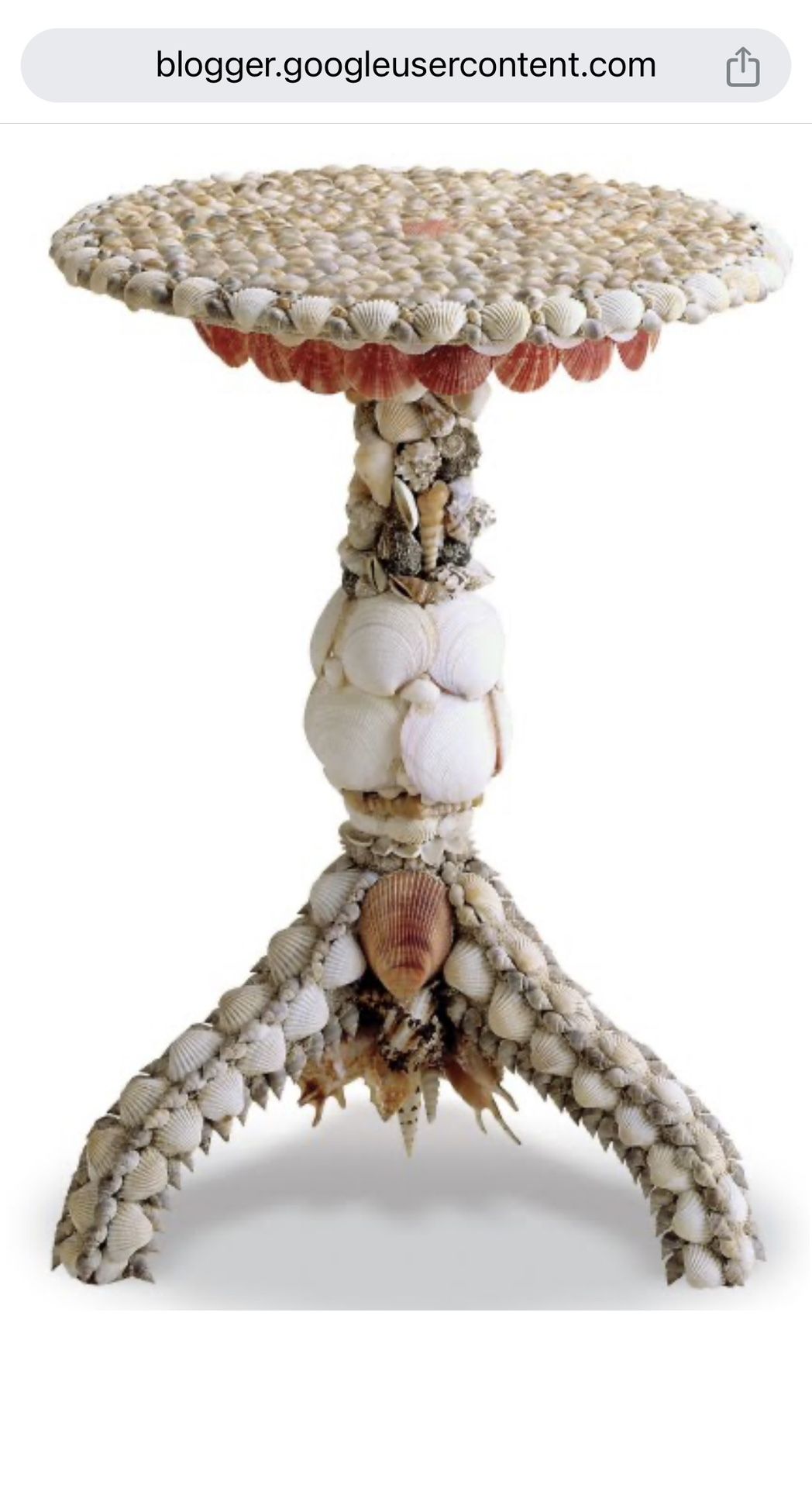 Rare Coastal Shell Encrusted Table This table is a stunning creation of natural shells, This small yet unique table is perfect as a great accent in a special room. The all natural shells are combined to provide details along with the scallop shells that add more details to the legs. Size: 20" round x 28" high. In the manner of Tony Duquette. Concrete with embedded & layered seashells