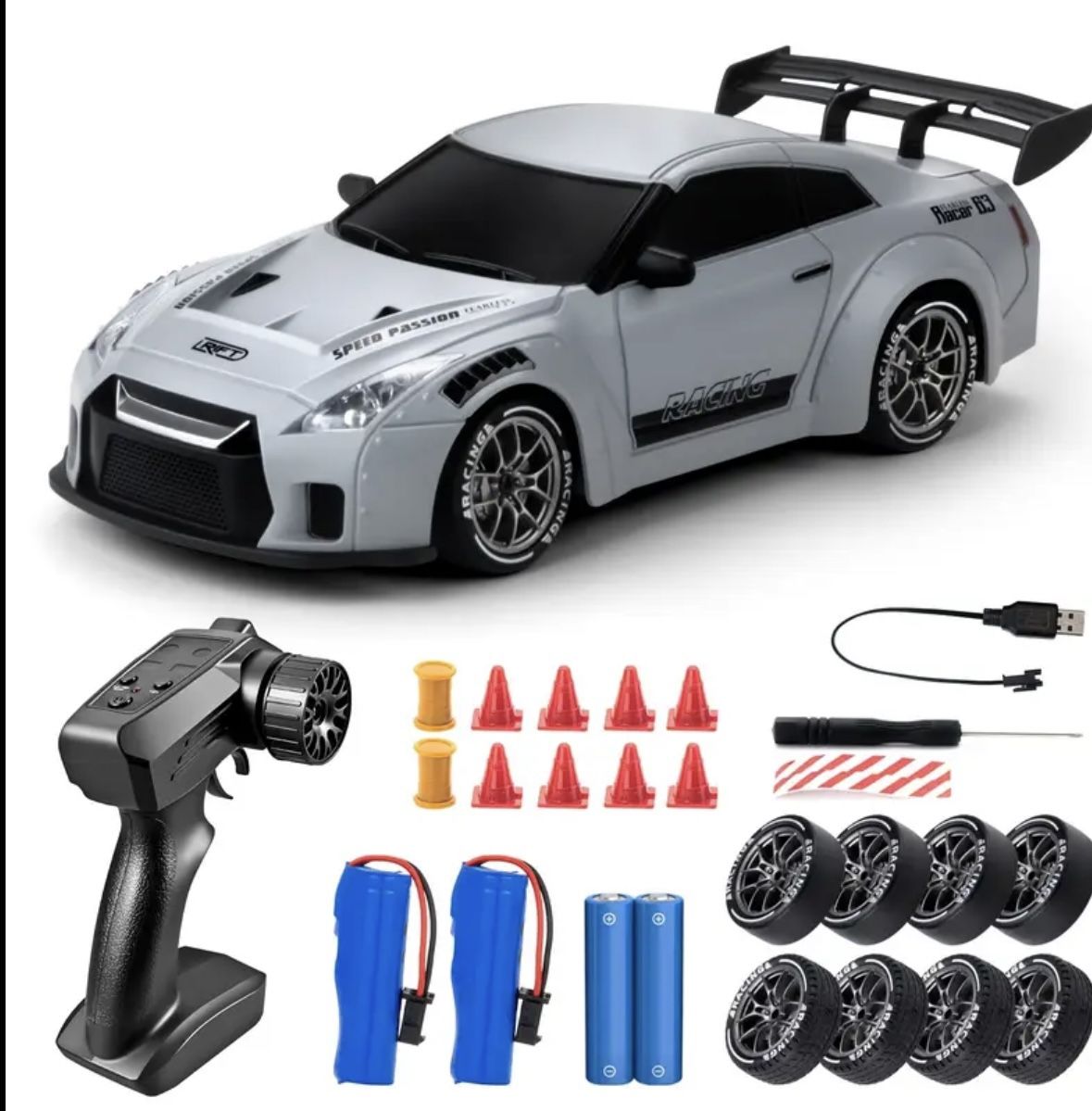 This is a professional drift car comes with everything you see. Only used one time still in box like new no scratches on nothing It is very quick so don’t really recommend for younger kids under 10