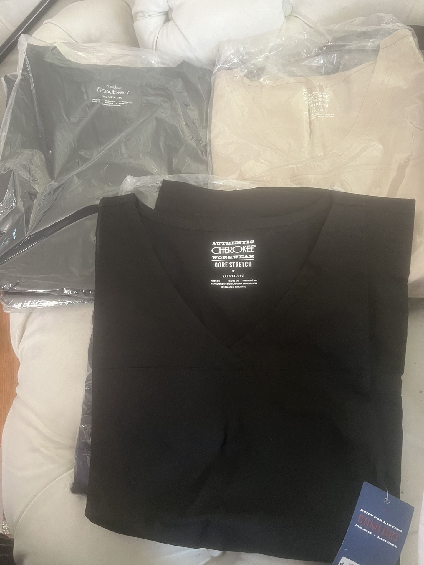 New top and bottom scrubs for $30 XXL black or beige. Original brand price: $60. Half off.