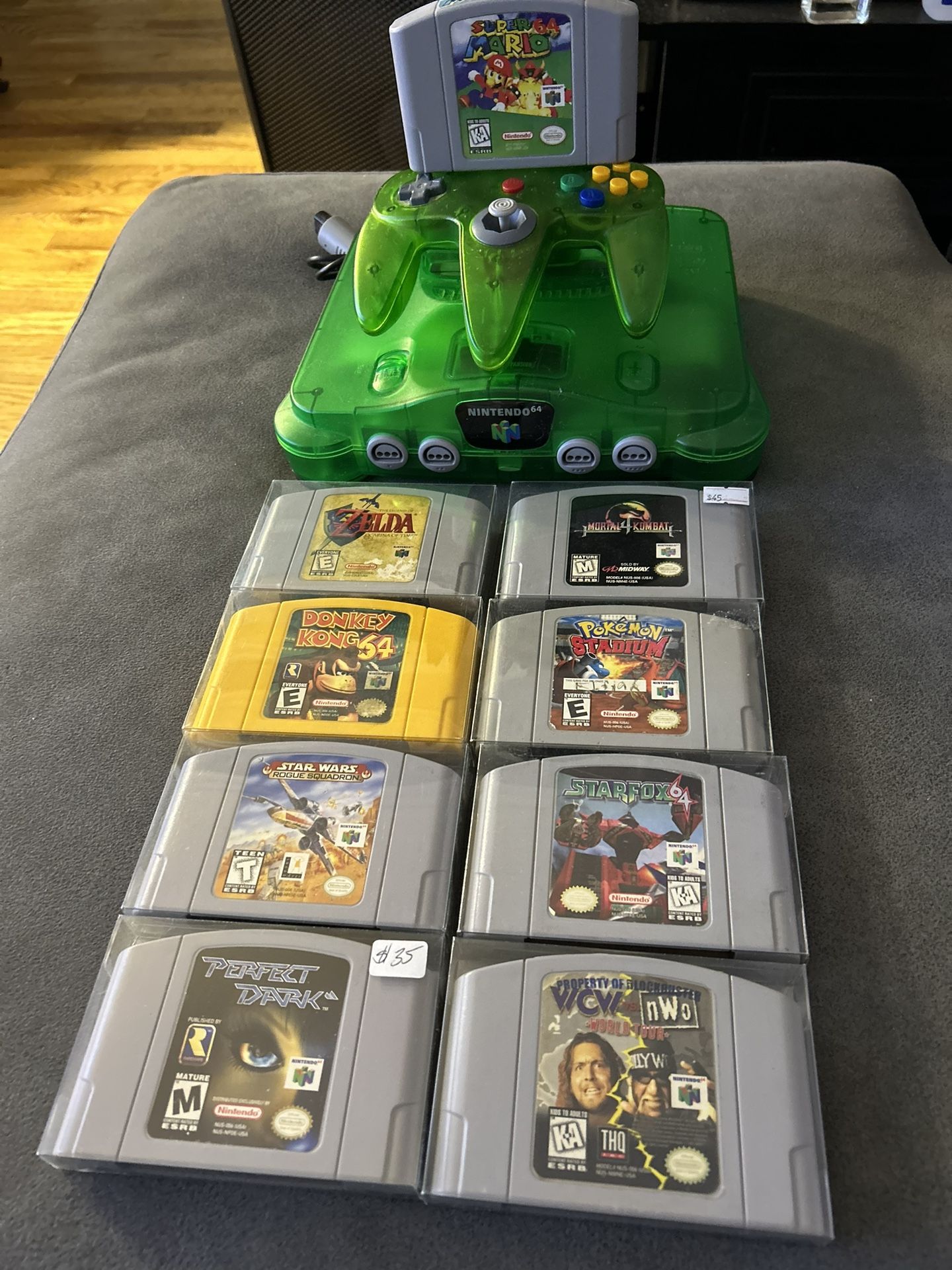 Nintendo 64 $225 Mortal 4 Kombat $35 Star Fox $35 Donkey Kong $45 Pokémon Stadium $40 Starwars $25 WCW $10 Zelda $65 Super Mario $45 Perfect Dark $35