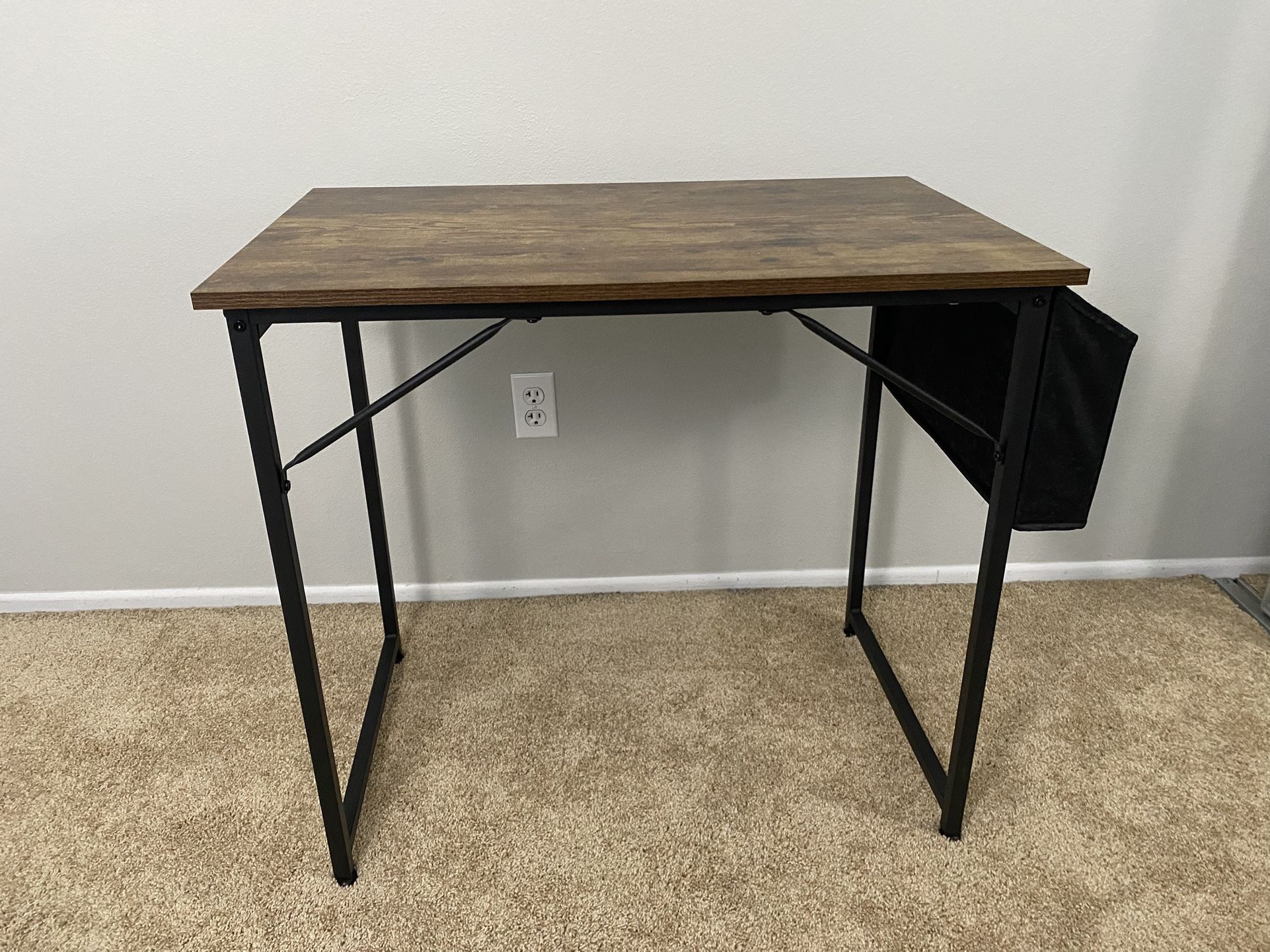 Details: • Width: 32 inches • Height: 29 inches • Sturdy black metal frame • Wood-look tabletop • Built-in side storage pocket for files, magazines, or laptop
