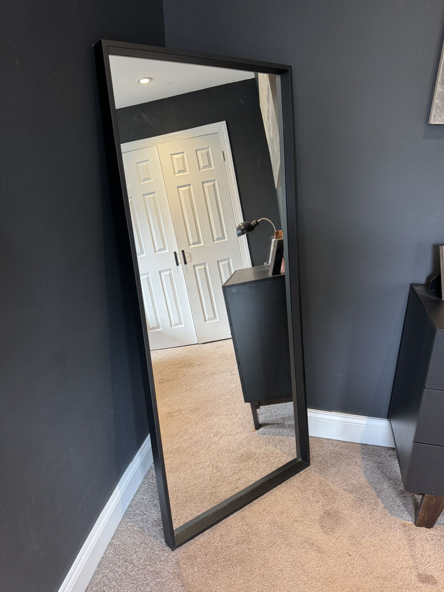 Large black framed full-length floor mirror. Can be leaned against wall or mounted. Clean modern look — perfect for bedroom, entryway, or apartment. Great for outfit checks and making a room feel bigger. Condition: Excellent, no cracks or damage.