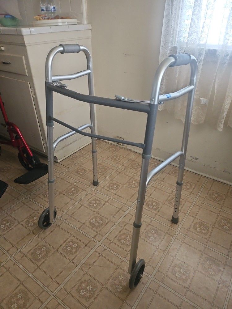 Adjustable aluminum front-wheel walker with lightweight folding frame and padded hand grips for comfort. Features height-adjustable legs, smooth-rolling front wheels, and non-slip rear tips for added stability. Easy to store and transport — ideal for recovery, mobility assistance, or everyday support. Good working condition with normal signs of use. Ready for pickup.