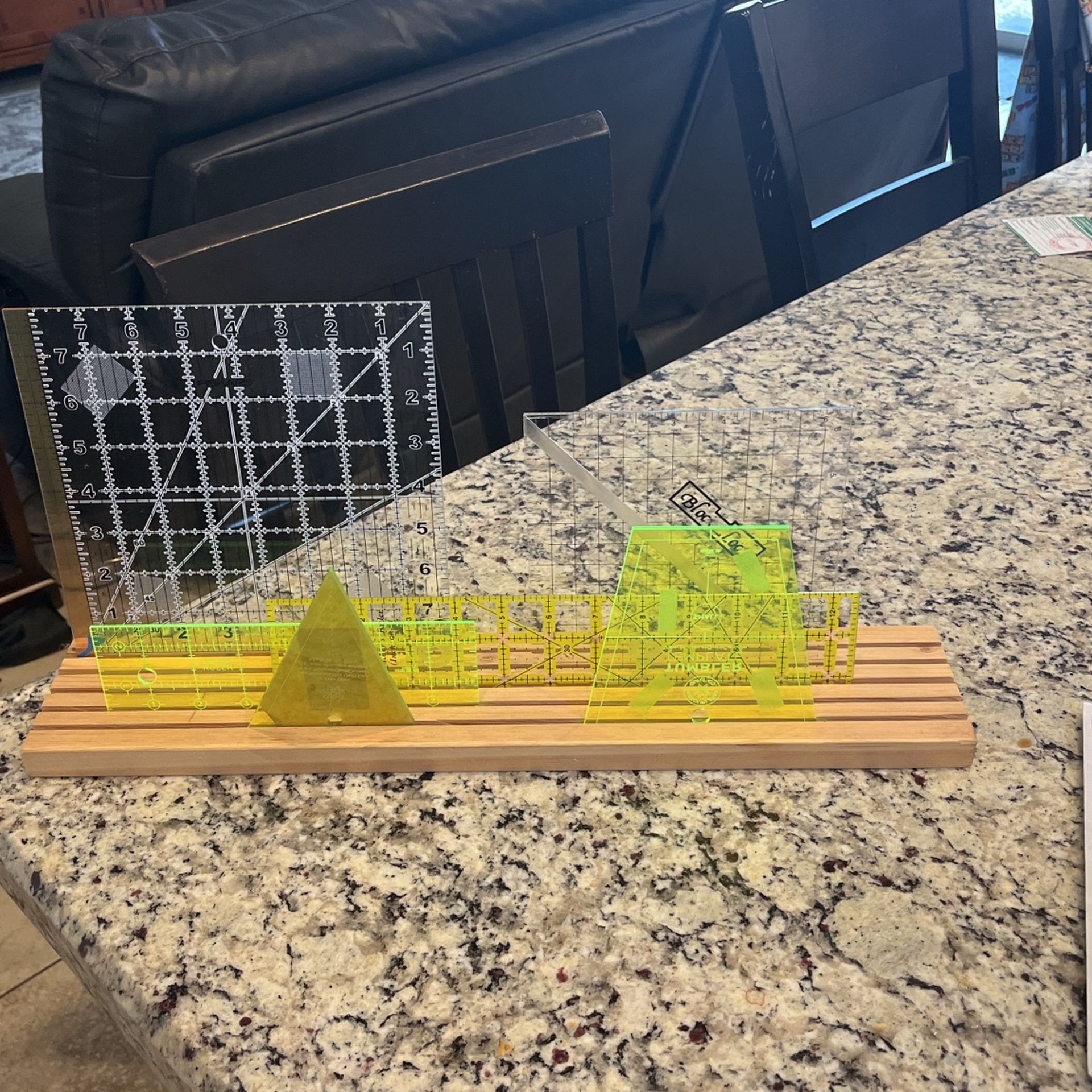 Wood quilt ruler holder. Approx 20” long. Has 5 slots for rulers or templates. Rulers/templates not included.