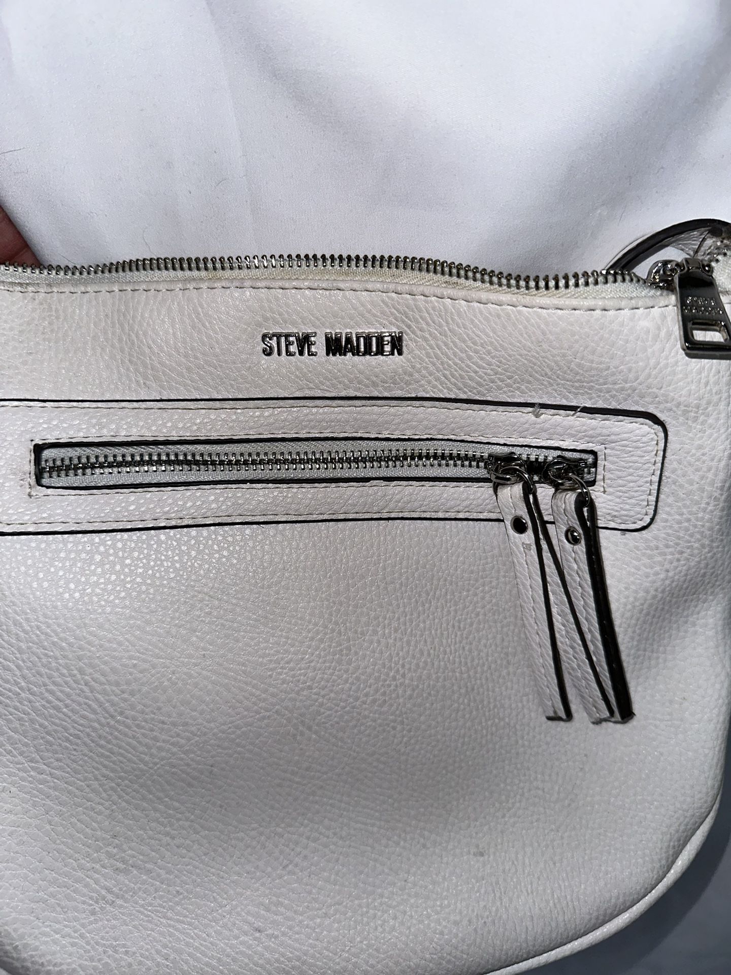 White Steve Madden purse, has two straps that are different lengths, one can be removed with clasp and is adjustable. Has front pocket on outside with zipper closure. Inside has one zipper pocket, two smaller pockets and main big area. Lining is black with Steve Madden written inside.
