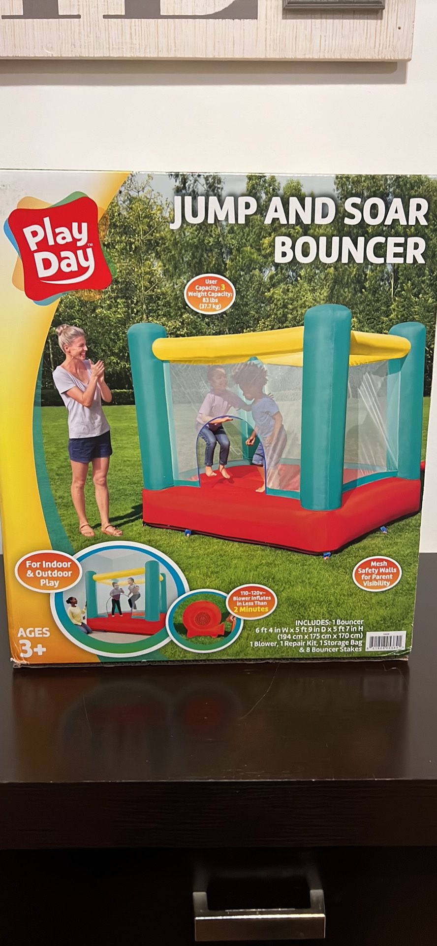 Unbox a gymnasium of fun with the Play Day™ Jump and Soar™ Mega Bouncer! The included blower inflates and deflates the bouncer in minutes, saving parents time and effort! This easy-to-set-up bouncer also has plenty of safety features that parents will love. The mesh sidewalls keep kids safe while also allowing parents to see them at all times. With one opening for entry and exit, parents can keep account of who is in and out of the bouncer, and kids can learn sportsmanship as they play. This bouncer can be used indoors or outside allowing kids a fun, safe place to explore and play. While they’re bouncing the day away, they’ll also be working on their gross motor skills, stimulating their imaginations, and growing their confidence and communication skills. They’ll be having so much fun, they won’t even realize they're learning! The Jump and Soar Mega Bouncer is the perfect year-round toy to foster hours of fun.
