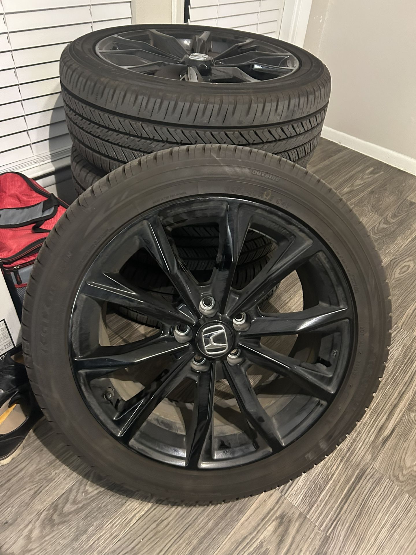 18x8.5 OE ENKIE HONDA WHEELS 5-114.3 WITH ALL OE LUGS NO CURB RASH NO BENTS NO WORPED WHEELS BRAND NEW TIRES 2025 YOKOHAMA’S YK-GTX 70k Mile warranty tires 11/32nds OF TREAD 235/45R18 SIZE PRICE NEGOTIABLE