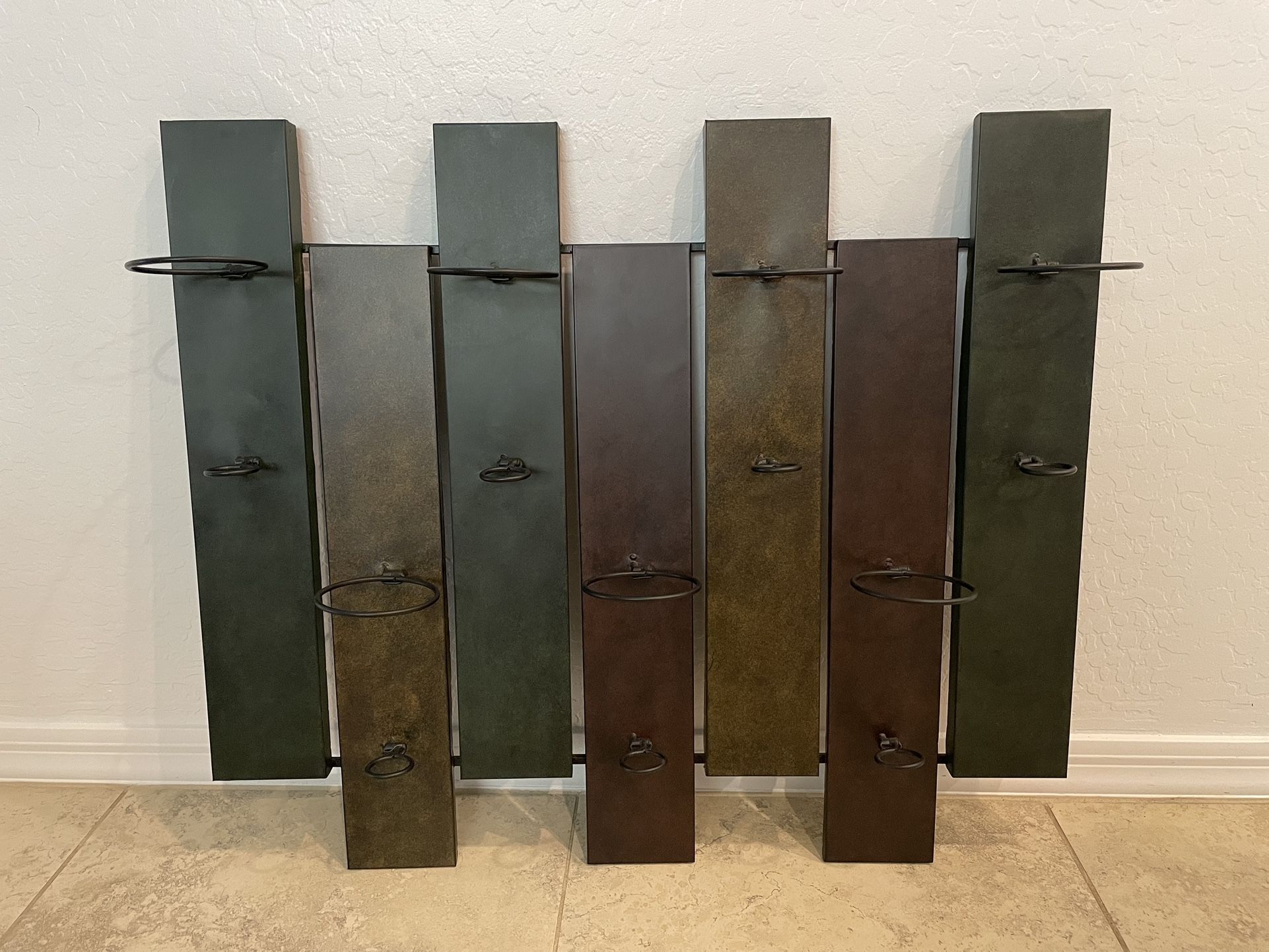 Wine rack. Hangs on wall. Holds 7 wine bottles. 28 inches wide, 32 inches high.