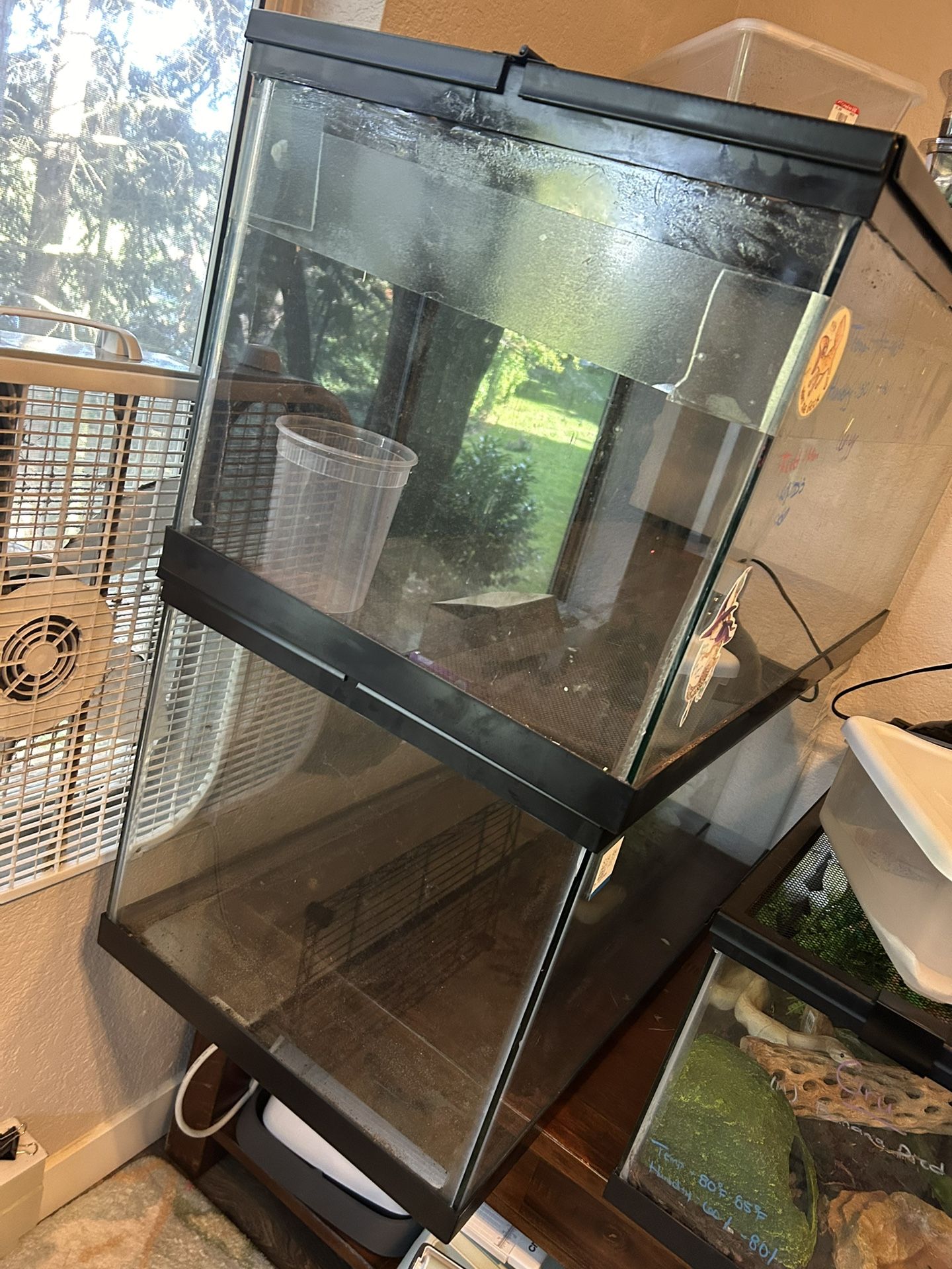 I have (2) 40 gallon tanks previously used for a snake & leopard gecko. They got moved into front opening tanks so these older tanks are not any use for us I still have to clean off the old styrophom backing/ / dirt and tape off which is fairly quick. Pick up only. Need to get rid of them ASAP before 10/10/24 :)