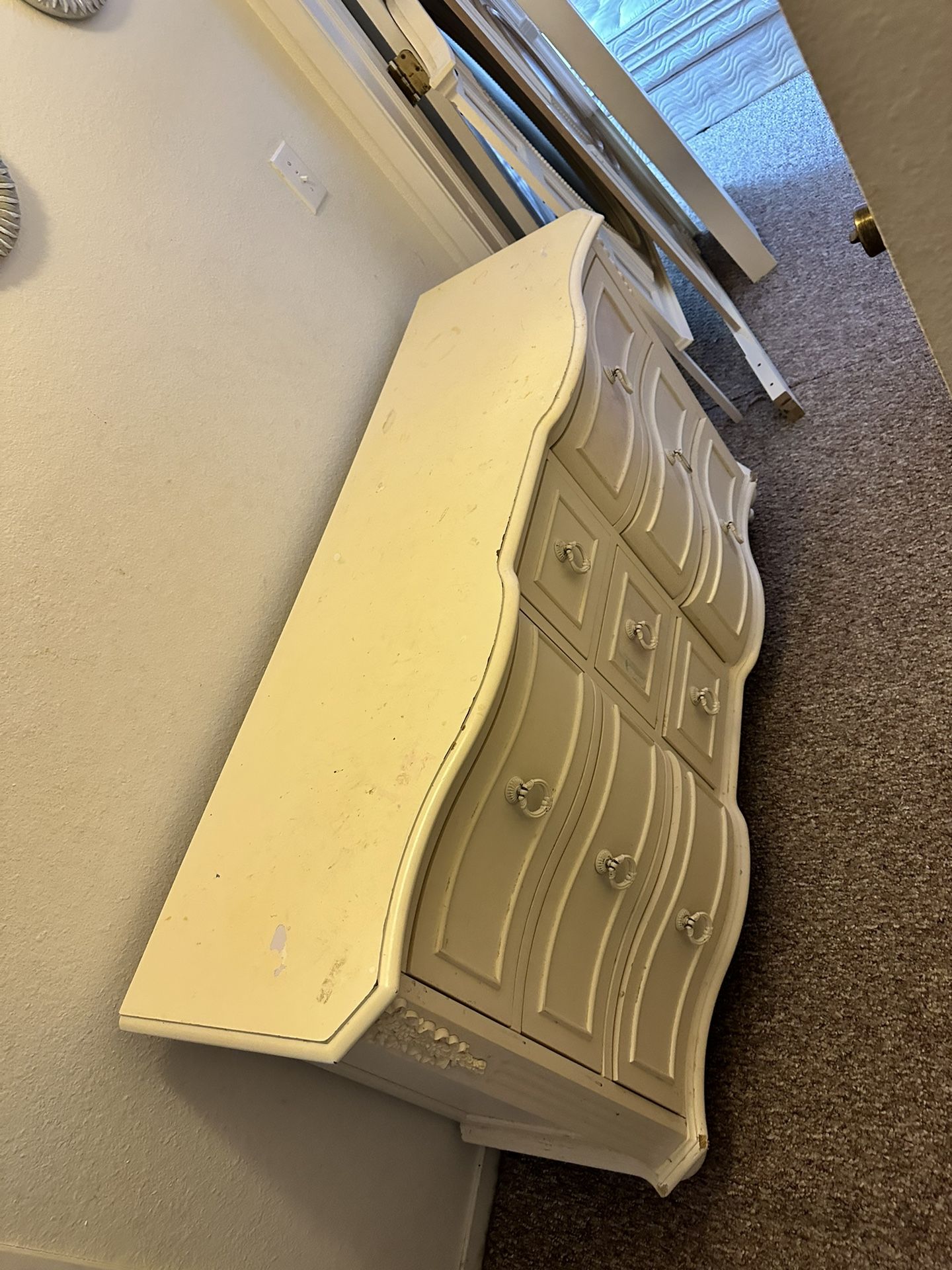 White - Large 9 drawer dresser plus oval mirror Head board, plus foot board and bed rails Heavy items