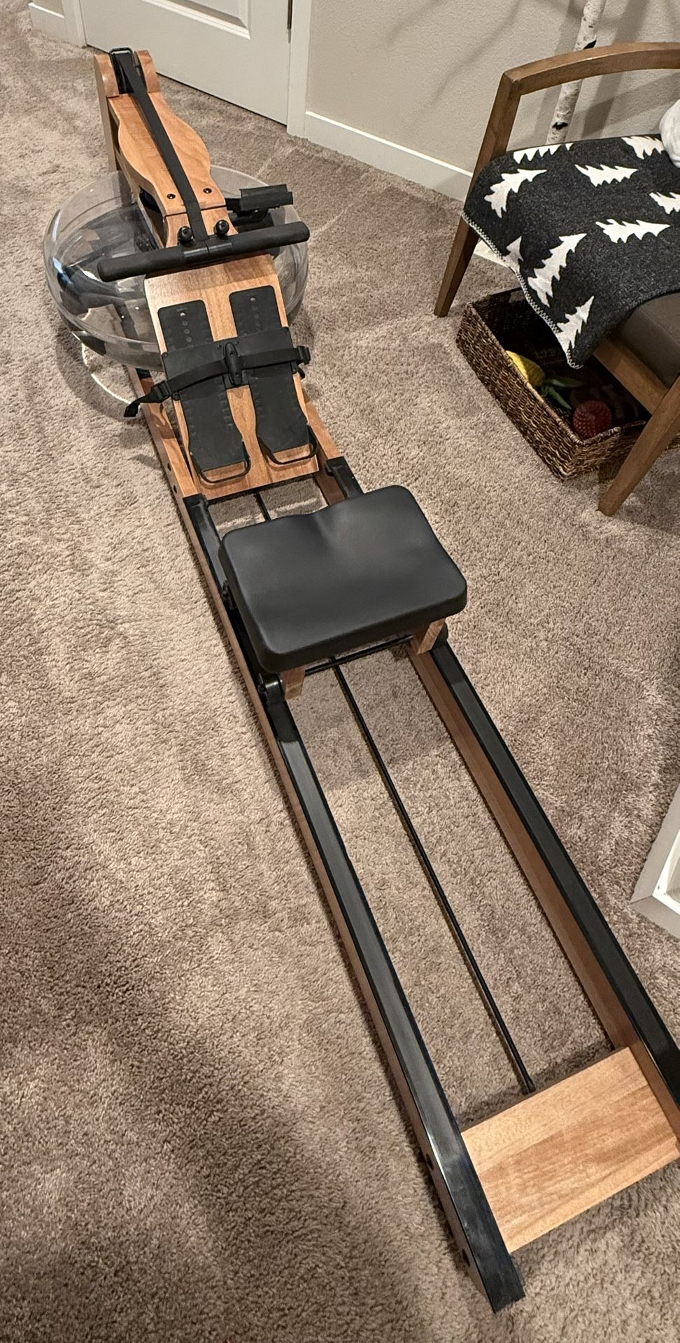 Gently used water rowing machine, works great and tilts up to fit behind a door or against a wall. Smooth glide, everything in working condition.
