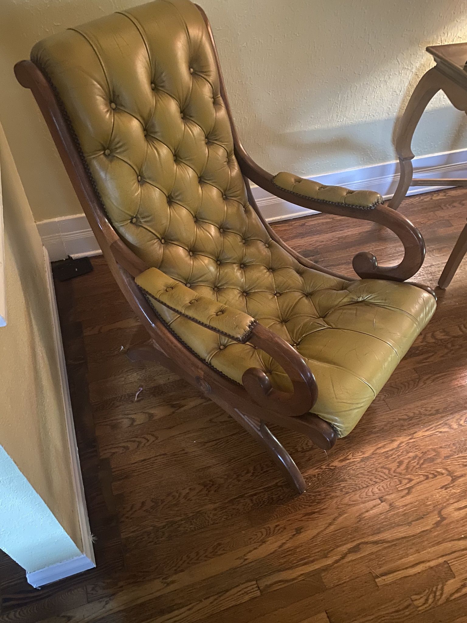 Hand carved chair, green leather with Tuckpointing on the leather.