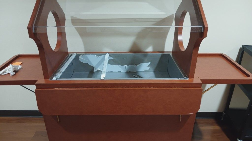 Portable dining hall salad bar. Takes hotel pans have an upper shield two fold down tables on each side and a fold-up table in the front. This is movable it has wheels and it is in really good shape.
