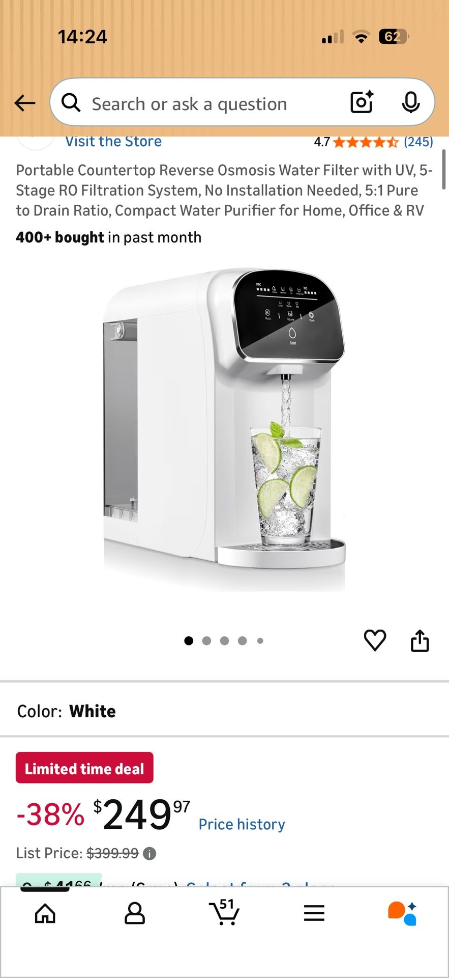 Portable Countertop Reverse Osmosis Water Filter with UV, 5-Stage RO Filtration System, No Installation Needed, 5:1 Pure to Drain Ratio, Compact Water