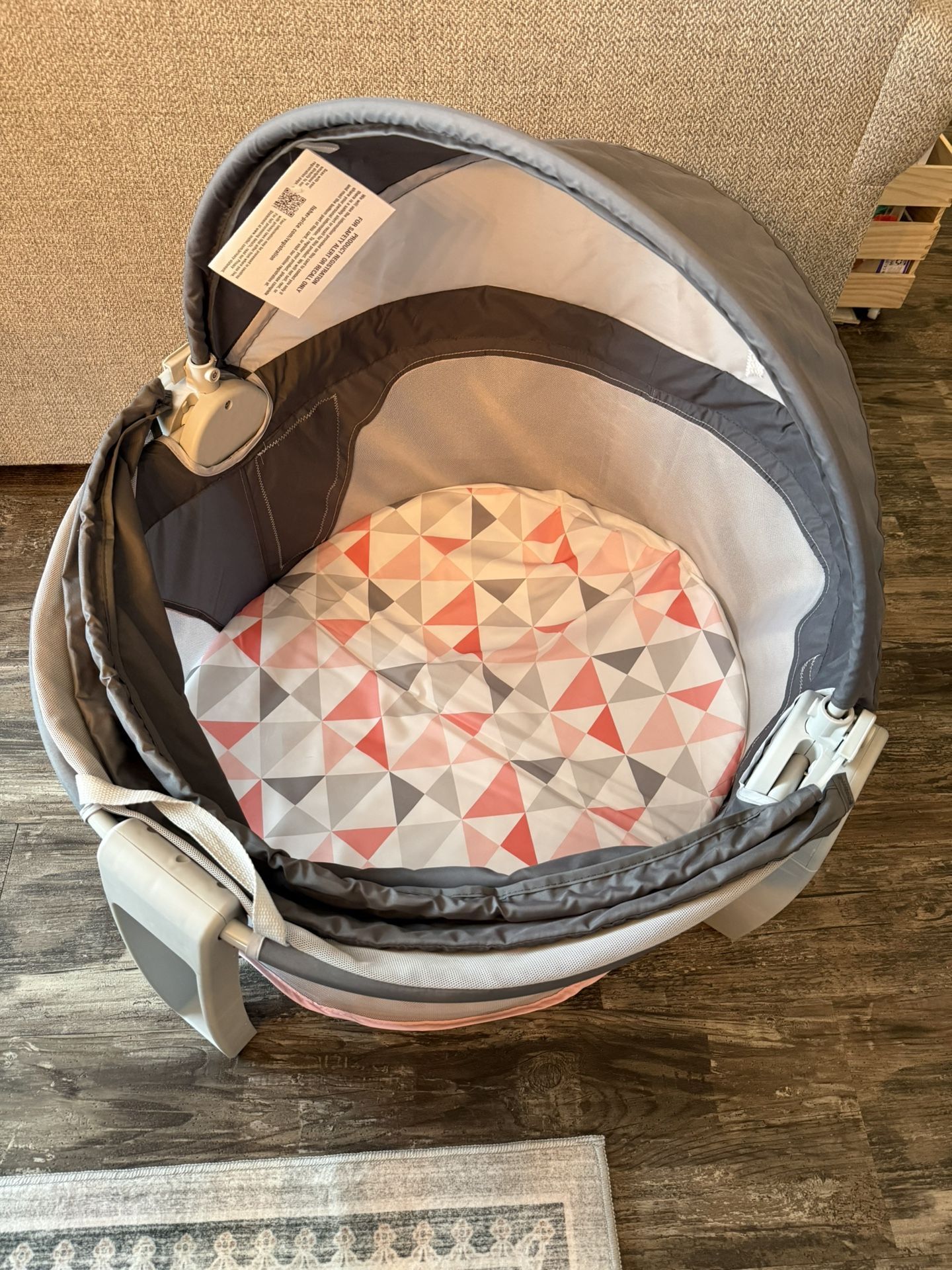 Great for camping, beach trips, or older siblings sports games! NWT. Comes with breathable canopy for shade but still great airflow, soft comfy pad to lay on. Most retail $85 new. Best for 0-5 months age or more given on comfortability. We took the toys off to wash them and I can’t locate them but any you will hang from there (I will keep looking). Has never been used. Small scruff on bottom just from storing. Use it indoors or out! Plus when you're ready to go, just fold the dome, grab the handle and go!
