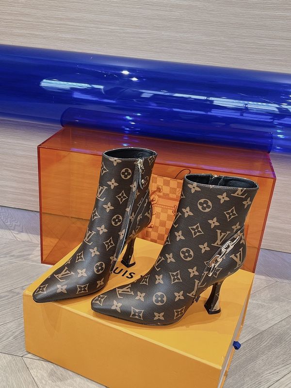 Louis Vuitton ankle boots featuring the brand’s signature monogram canvas in brown with black accents. The boots have a pointed toe, slim high heel, and side zipper for easy wear. The monogram pattern covers the entire upper, making them a standout fashion piece that combines classic Louis Vuitton design with a modern, elegant silhouette. They are presented on a Louis Vuitton box, which suggests their authenticity and luxurious status. These boots are suitable for both high-fashion and chic streetwear looks.