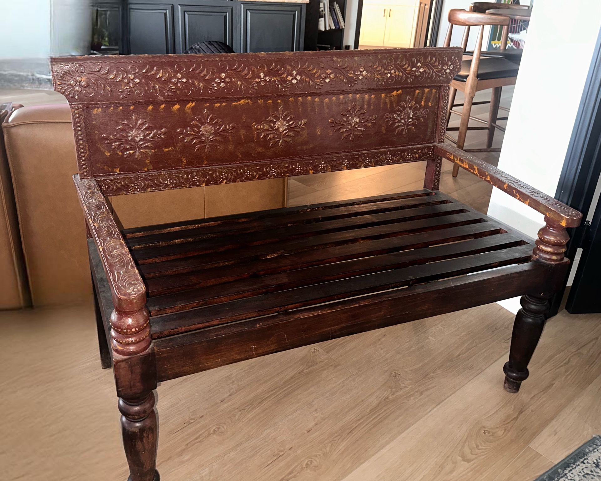 Beautiful carved wooden bench with a rich dark finish and detailed floral craftsmanship on the backrest and arms. The bench is in good condition with natural character from age that adds to its vintage charm. It comfortably seats two to three people and would also work great with cushions for extra comfort. Great statement piece for anyone who loves antique or vintage furniture. Approximate condition: Good / solidStyle: Antique / vintage carved woodUse: Entryway bench, accent seating, or decorative piece
