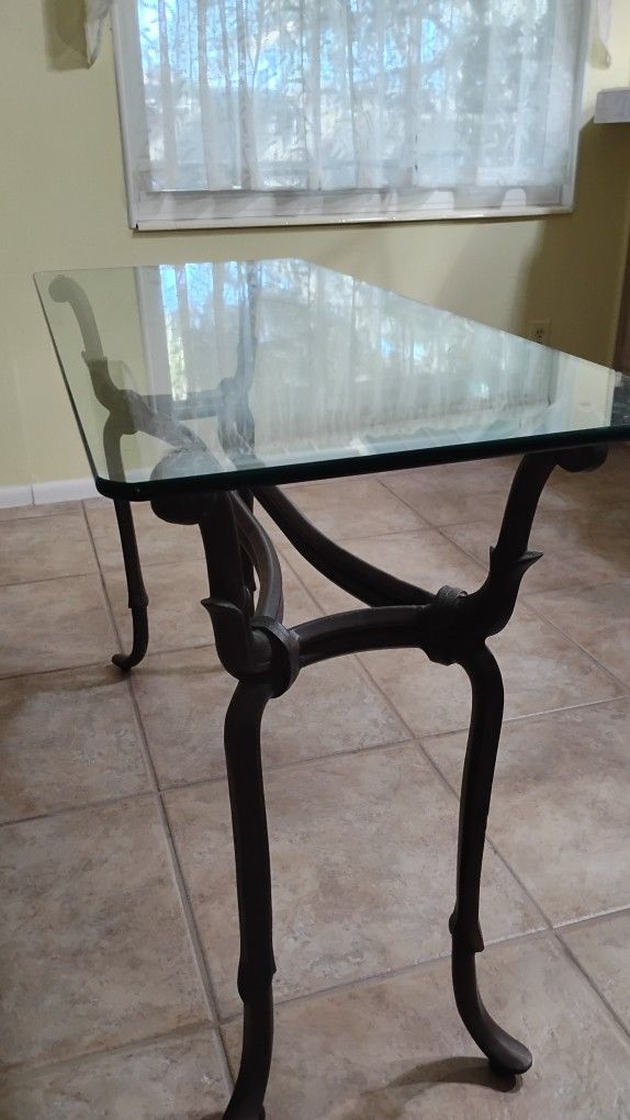 Great looking glass with metal base and legs. 44" high 29" high 18" deep. Pretty decor for any room