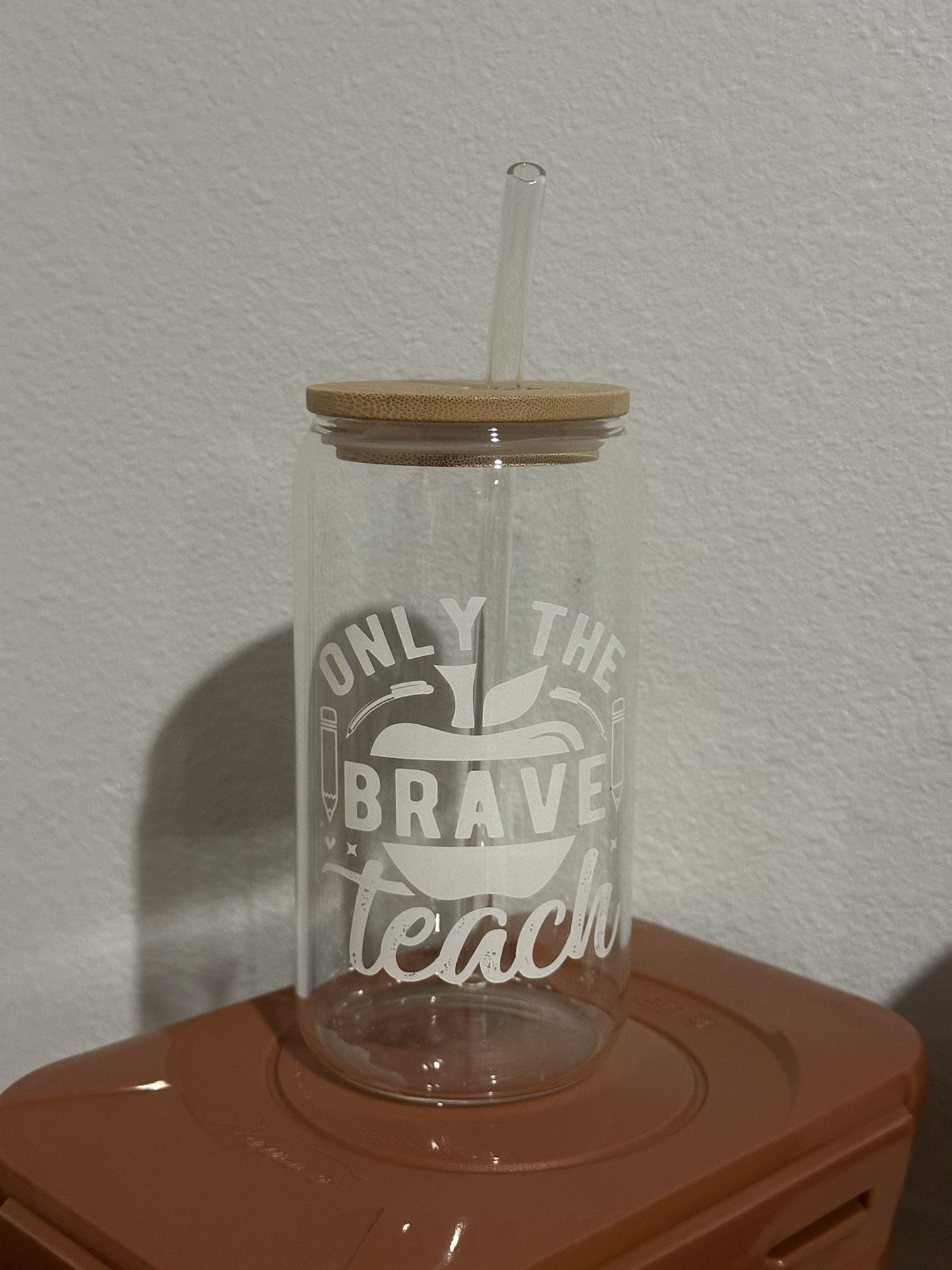 Cute teacher gift! “Only The Brave Teach” Glass Cup with wooden lid and glass straw