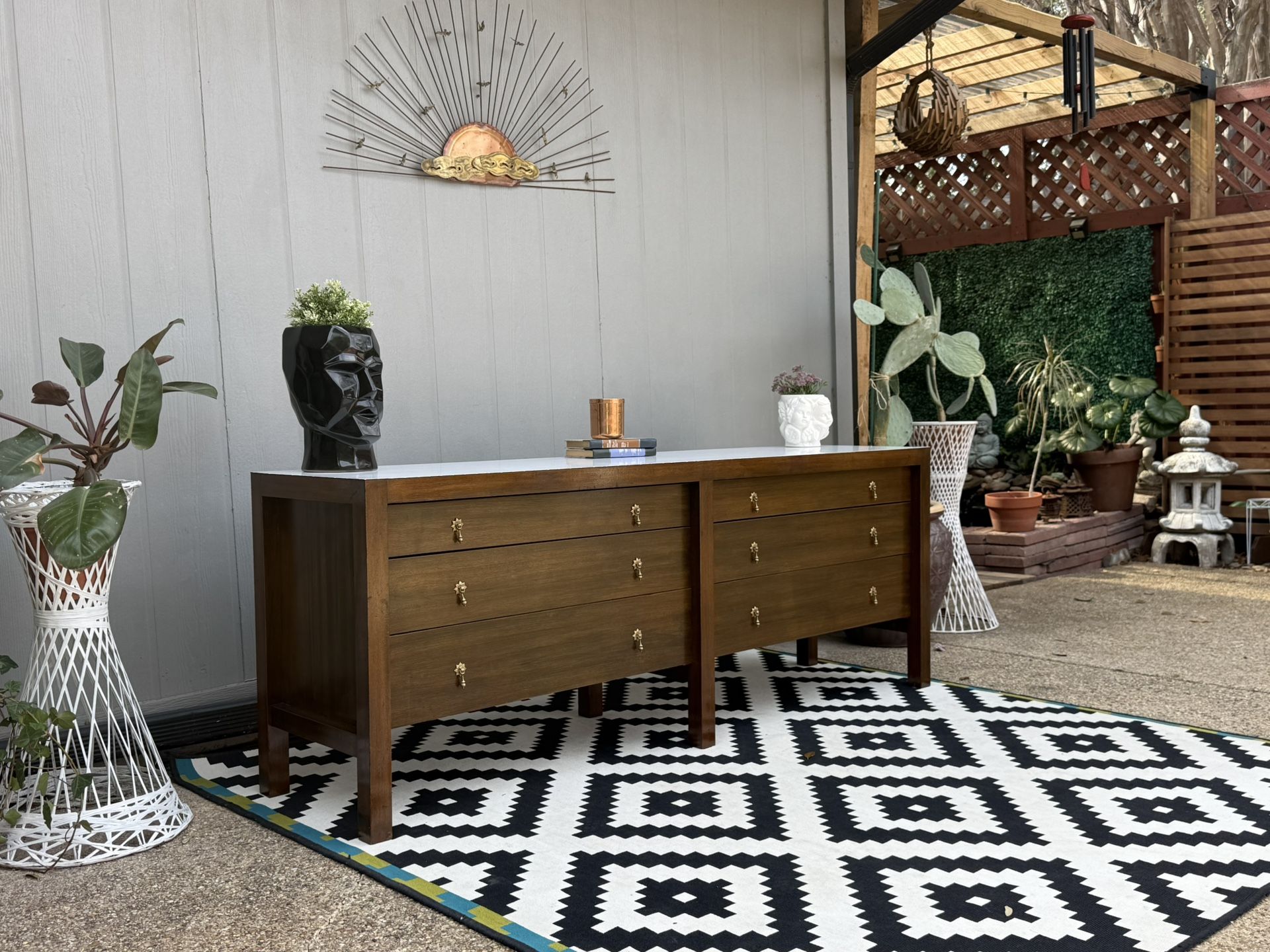 This is a vintage mid century Sideboard / console cabinet . Featuring 6 drawers with 3 different sizes that open and close smoothly with unique brass handles that add contrast and elegance to this piece , solid wood and formica top . Versatile piece that can be used as low buffet cabinet , long console table , low boy dresser etc . In good vintage condition with some minimal sings of wear according to its age that it’s not too noticeable and doesn’t affect the functionality of the piece . Measurements are : Tall 27 1/4 “ inches . Long 72 “ inches . Wide 18 “ inches . $ 575 First comes first served . Pick up in north dallas . All sales are final .