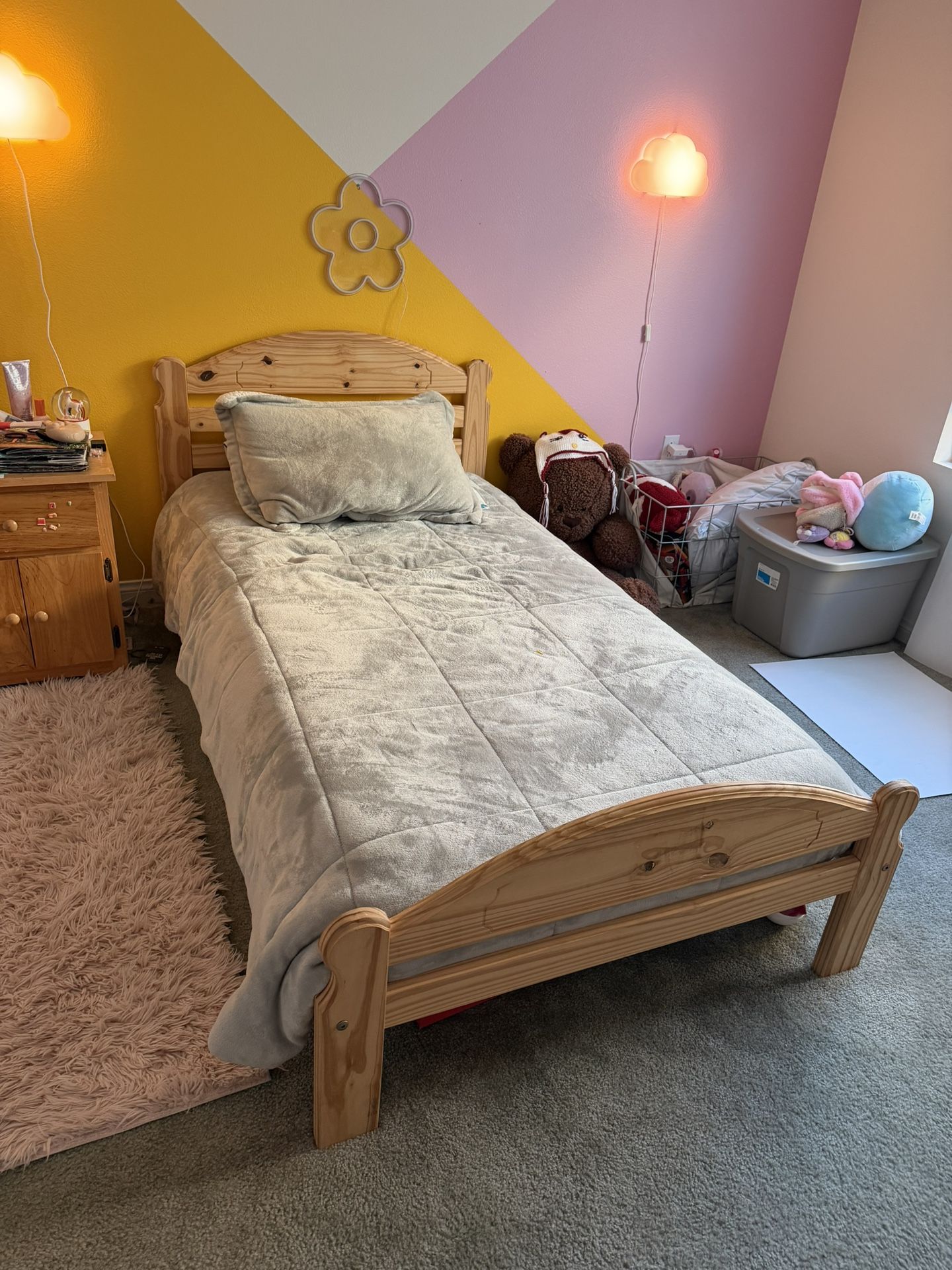 Beautiful twin bed with night stand made of pine wood. The bed is in really good condition and it a solid bed. The night stand could use a little tlc. No mattress included ☝️