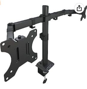 BRAND NEW still in the box! Amazon ASIN: B09PFCWVTH :: CLID: A2935 Amazon Description: [Compatibility] VESA bracket 75x75 and 100x100 can fit any flat monitor up to 32inch screen size and 17lbs of weight. [Dual Monitor] Capable of holding two monitors (27in/17lbs per arm) and open up your desk space. Also has built-in cable management option in form of detachable clips along the center poll and arm so your work space will look organized and sleek. [Ultimate Adjustability] Adjust position of your screen in any direction. Adjustable height 16inch along the mast, with multiple adjustable joints in any direction, 45° to -45° tilt, 180° swivel, 360° rotation for vertical or horizontal orientation. [Easy Setup] Full setup can be done in 10 minutes all required tools come with the product, to make sure you never lose them there is a tool bracket on the arm itself. Detachable VESA bracket. [Sturdy and Stable] Excellent build, made from aluminum and steel for maximum stability and durability.