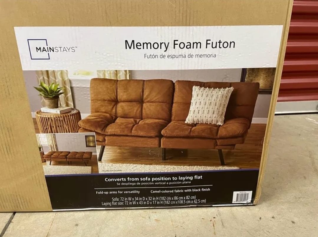 Memory Foam Futon, Camel Faux Suede Fabric $150 Description New in box / price is firm $150 Memory Foam Futon, Camel Faux Suede Contemporary design upholstered in soft, camel faux suede fabric . Split seat and back . Memory foam provides good support • Converts from sofa to sleeper in seconds . Foldable winged armrest Sturdy wood frame and metal legs . Supports up to 600 lbs. . Fill: 100% polyurethane foam • Upholstery: 100% polyester. . Simple assembly required. Manual included. Seat dimensions: 72"W x 34"D x 32"H. Sleep dimensions: 72"W x 42.5"D x 16.5"H. Weight: 90 Ibs
