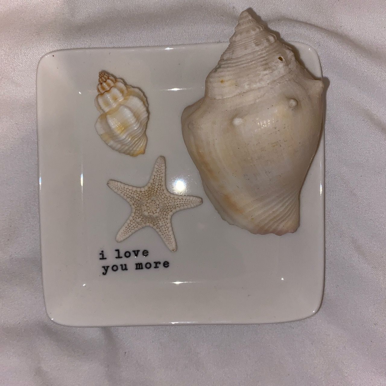 white “i love you more” ring tray will come with shells