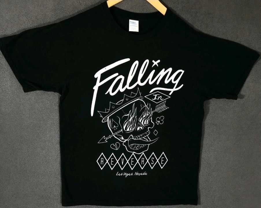 This Falling In Reverse black graphic tee features a bold Las Vegas design with a flaming skull, arrow, crown, and playing card symbols, capturing the band’s raw energy and edgy style. Printed on a Port & Company Fan Favorite ring spun shirt, it has a soft, comfortable feel and durable print. Perfect for fans of rock, post-hardcore, and band merch collectors, this piece delivers a striking streetwear vibe with classic concert tee appeal.