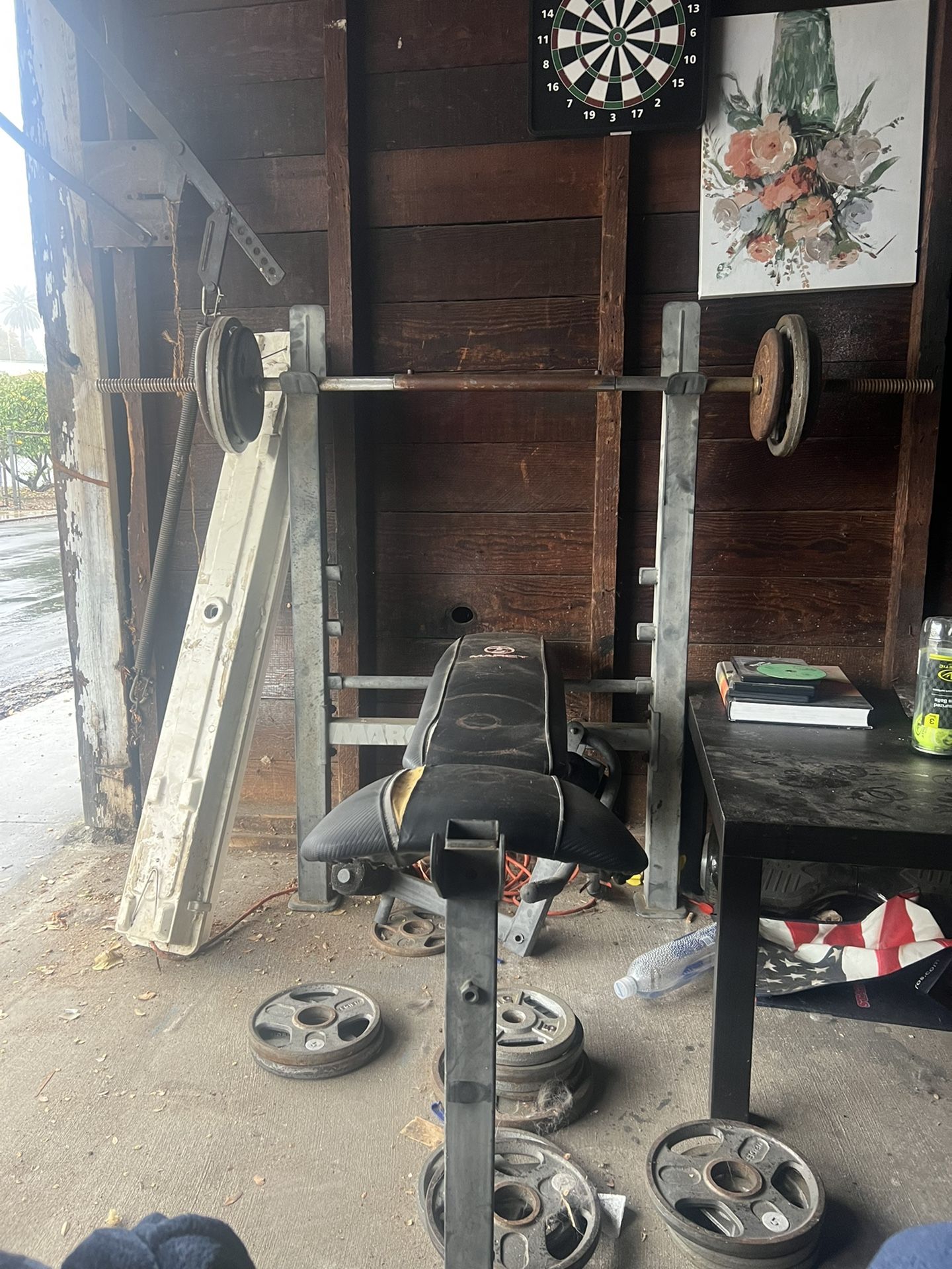 Bench with weights 55 pounds in 5s 70 pounds in 10 With bar and bench X7 10s X11 5s