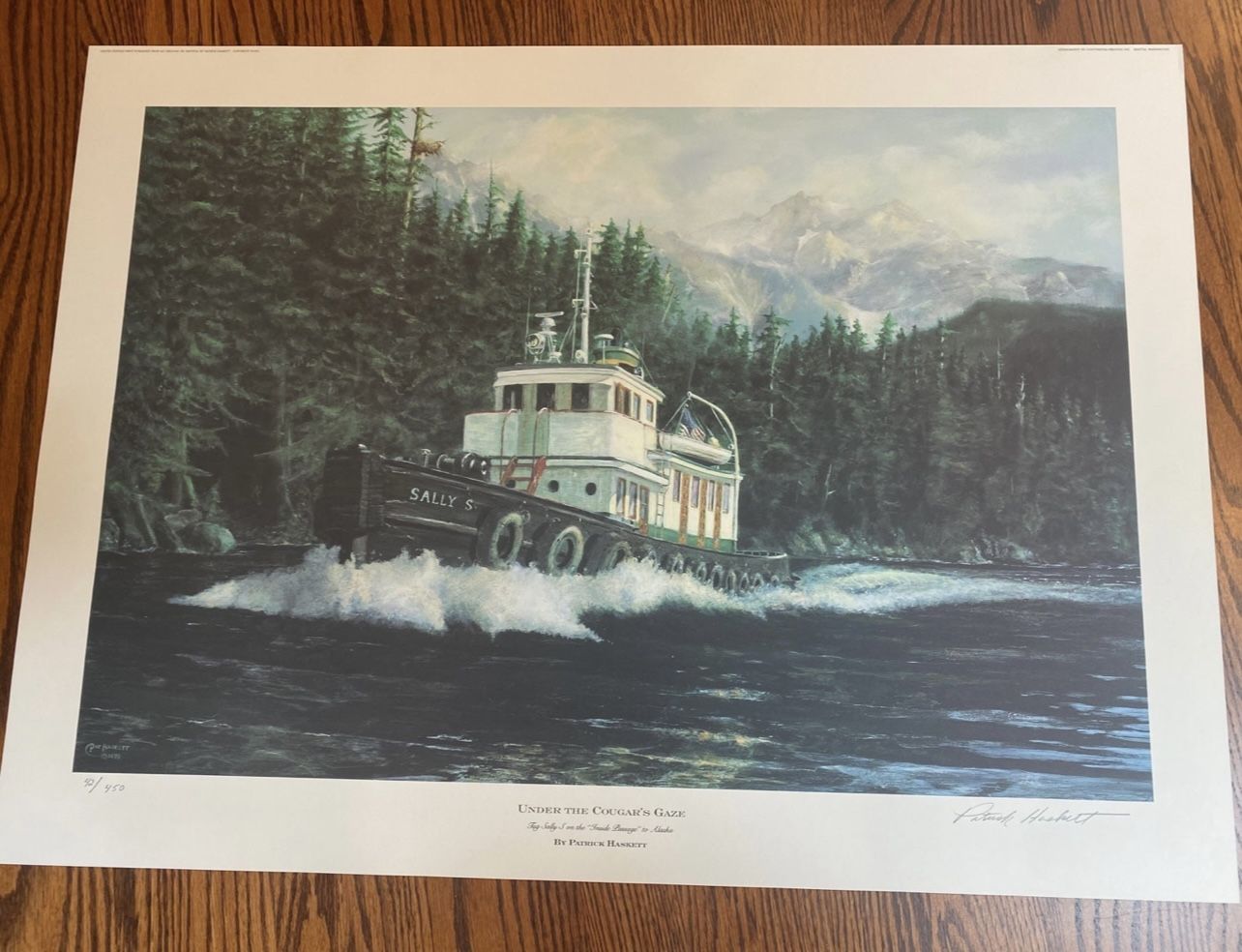 Under the cougars gaze by Patrick Haskett. Tug Sally S on the inside passage to Alaska. See if you can find the cougar. 24”x33” Limited edition print. Pick-up in Lynnwood, WA Message me with any questions.