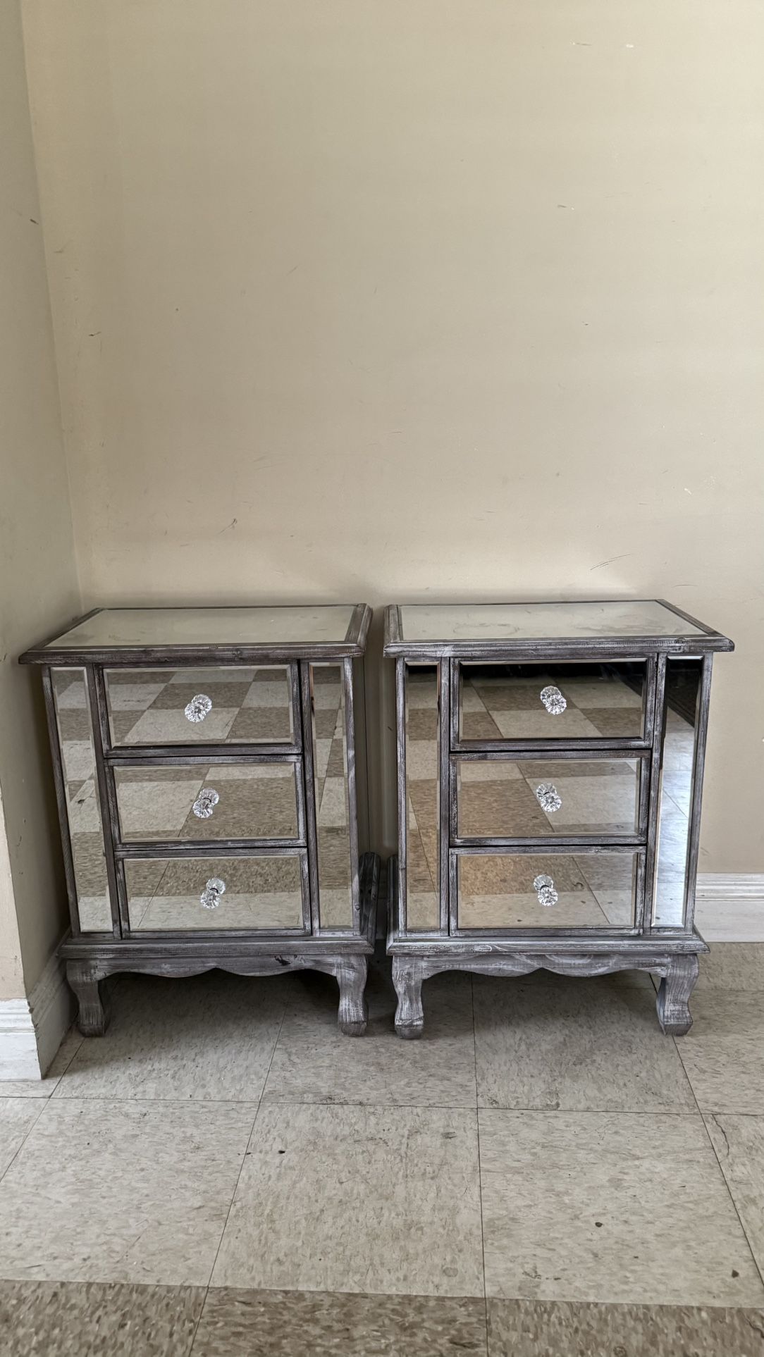 Mirrored End tables / nighstands with wood trimmings. Approximate measurements: 2.’1” H x 1’7” W x 1’D Cash and pick up only.