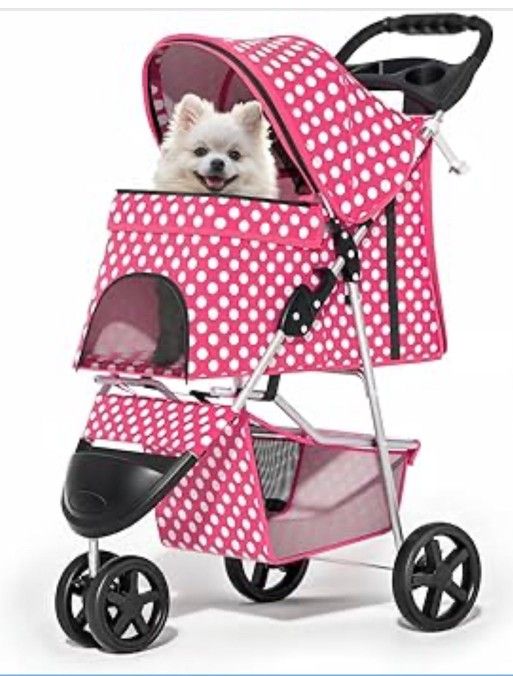 3-Wheel Pet Stroller for Small and Medium Dogs and Cats, Foldable, Walking Stroller with Storage Basket and Cup Holder, Bright Pink with Polka Dots Brand new I can do delivery with an extra gas I invite you to see the entire list of items I sell Hablo Español S12BW