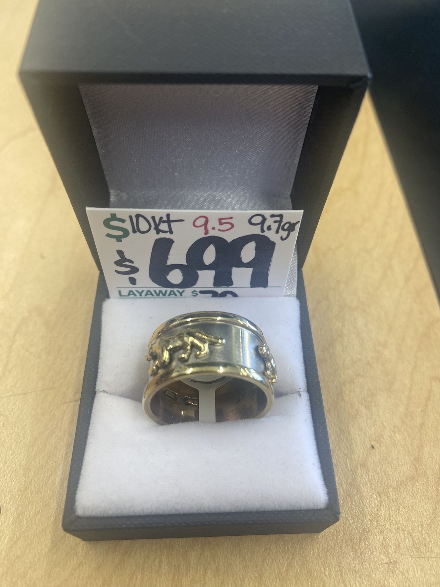 10kt ring size9.5 weight 9.7 grams. Layaway available 10% down and 6 months to pay it off.