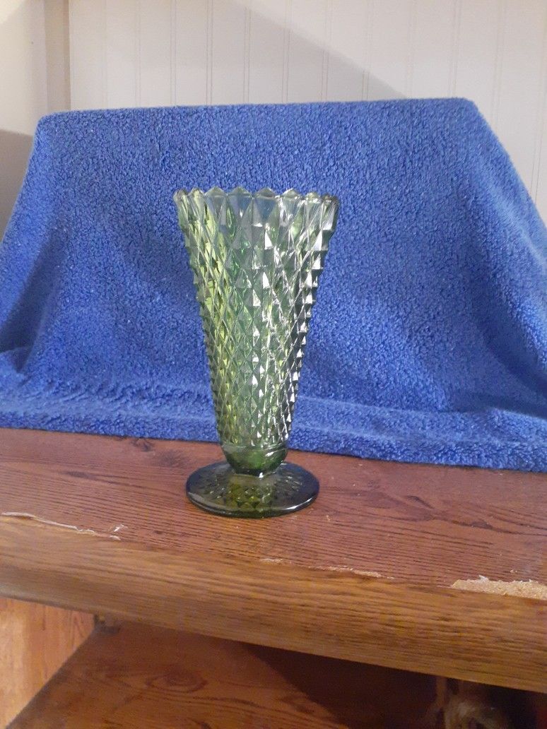 Vintage Green Indiana Glass Diamond Point Vase 8" Tall
