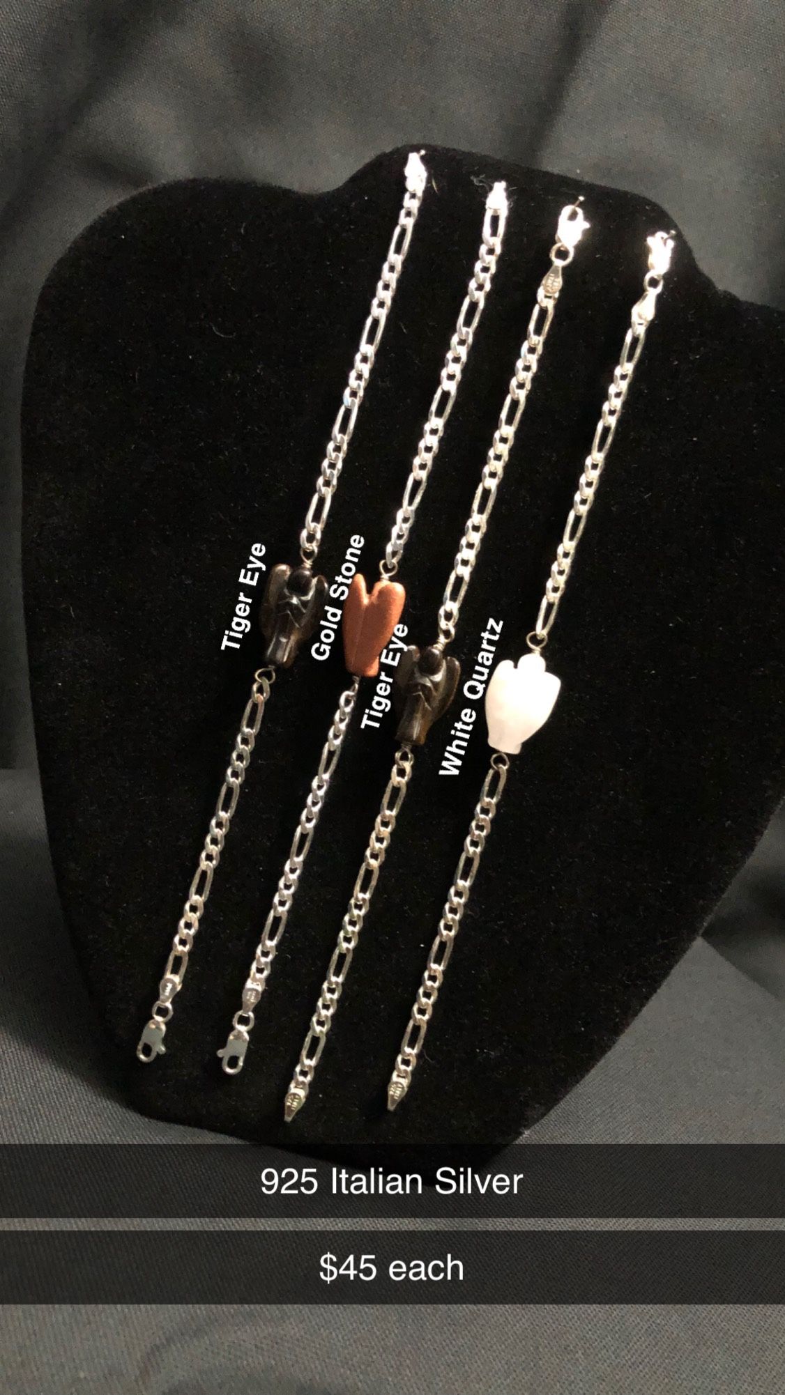 Crystal angel on 925 Figaro style chain bracelet 2 Tiger Eye 1 Gold Stone 1 White Quartz $45 each