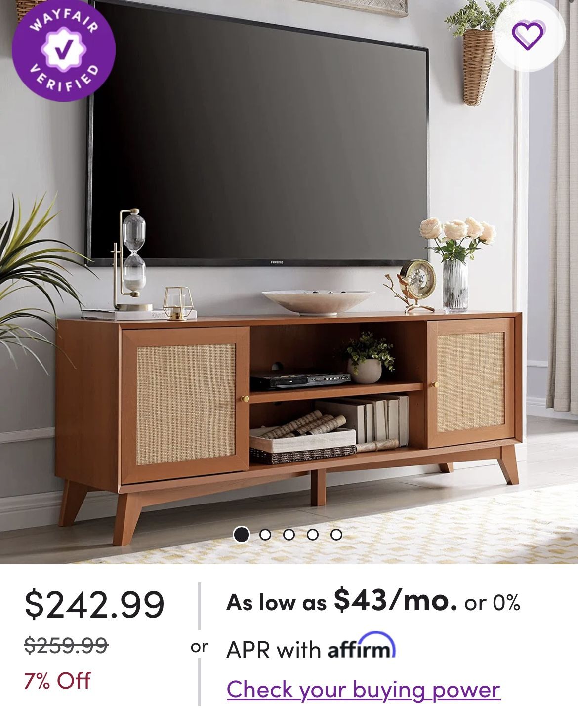 Mid Century tv stand from Wayfair less than 1 year old! There is water damage on the top, but it’s not noticeable with the darker wood tone. There are two very small areas where there’s a little damage (arrived like that). I was able to cover with wood paint (left corner) and wood glue (right door by handle). Please see last three pictures. “This TV stand is ready to bring a mix of modern and coastal styles into your living room. It's clean-lined and crafted from engineered wood, and it rests on flared legs for a mid-century vibe. We especially love the cane detailing on the two cabinet doors for a breezy touch. Interior shelves and two central cubbies give you space to tuck away DVDs, games, consoles, and media players. Cable-management cutouts help eliminate clutter, while the top is large enough to accommodate flat-screens up to 75". Features Top shelf capacity: 150 lbs. Middle/bottom shelf capacity: 50lbs. / 30 lbs. Two natural rattan doors that provide a boho-chic vibe. Ideal for multiple locations around your home - from living room to bedroom. One open shelf and 2 cabinets for display and storage space. Two cable management ports to keep cords tidy.”-Wayfair